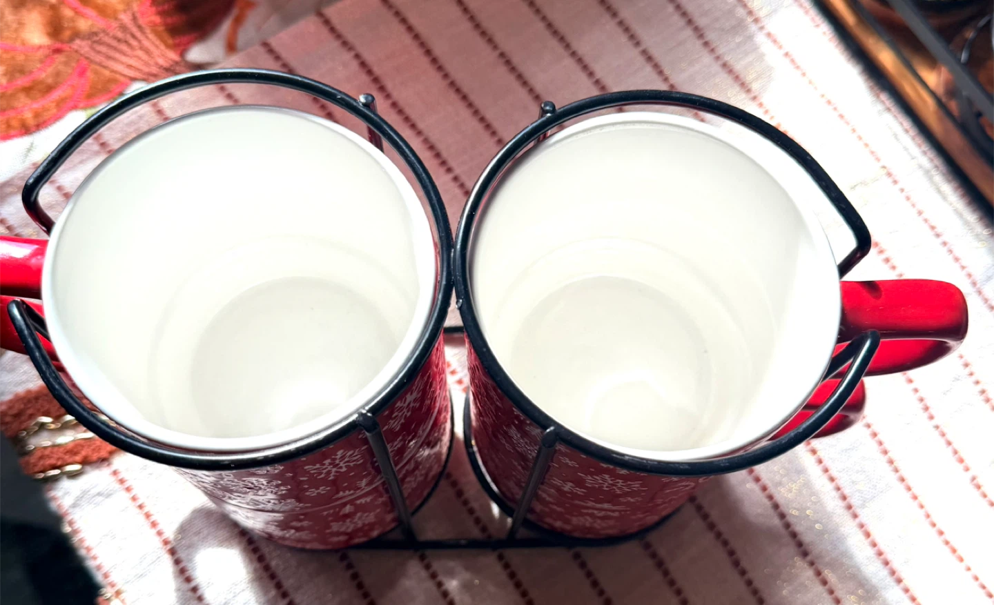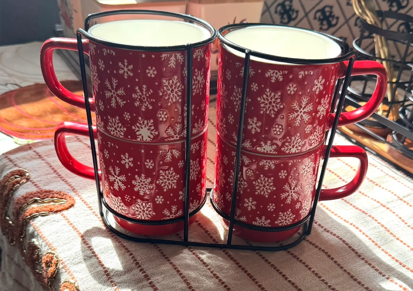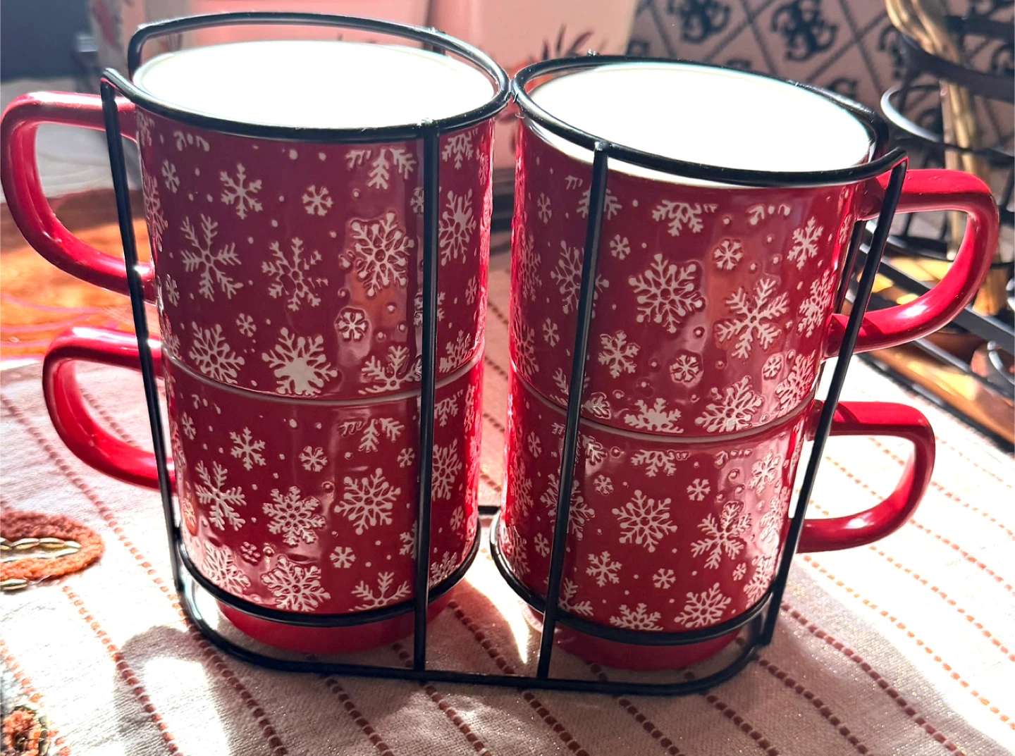 Selling a set of four red mugs with a snowflake pattern, complete with a metal stand. These mugs are perfect for adding a festive touch to your kitchen or enjoying a cozy drink during the holidays. They're in great condition and ready for a new home!