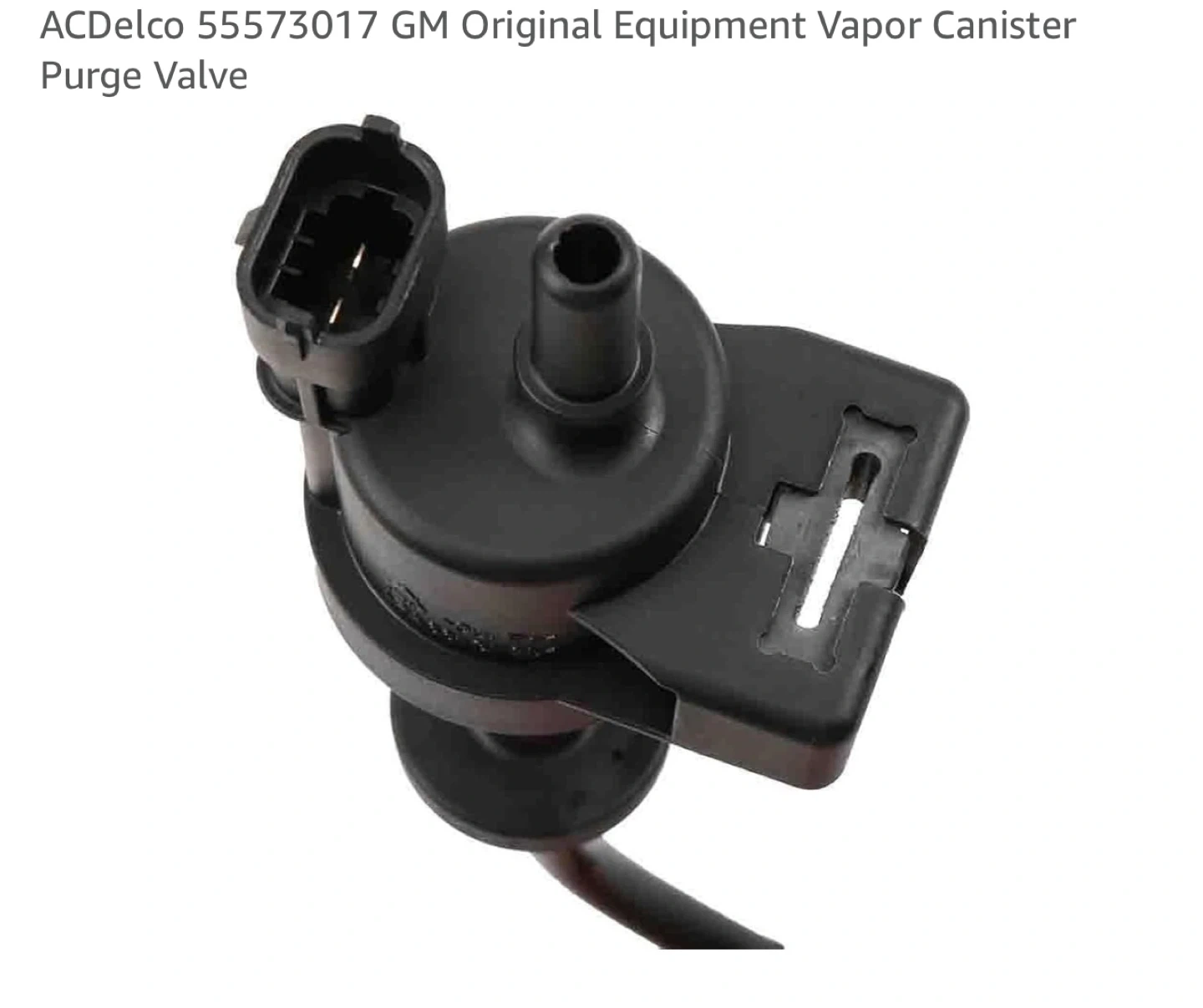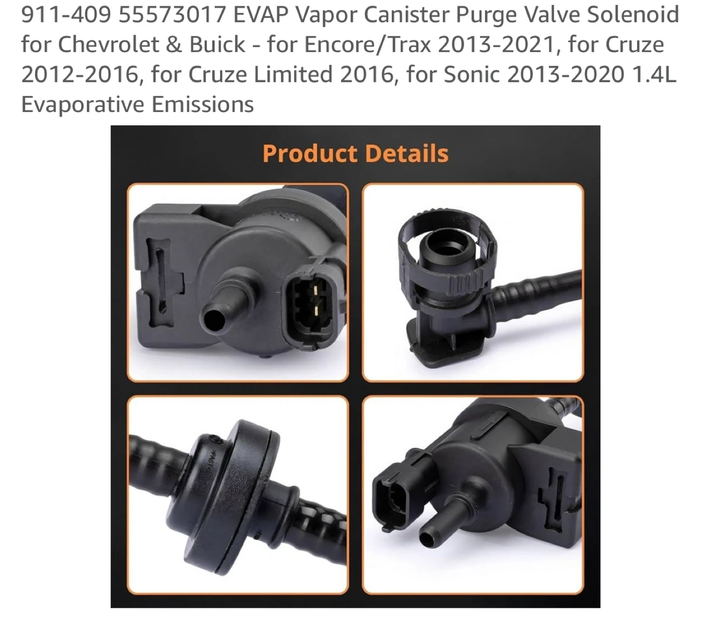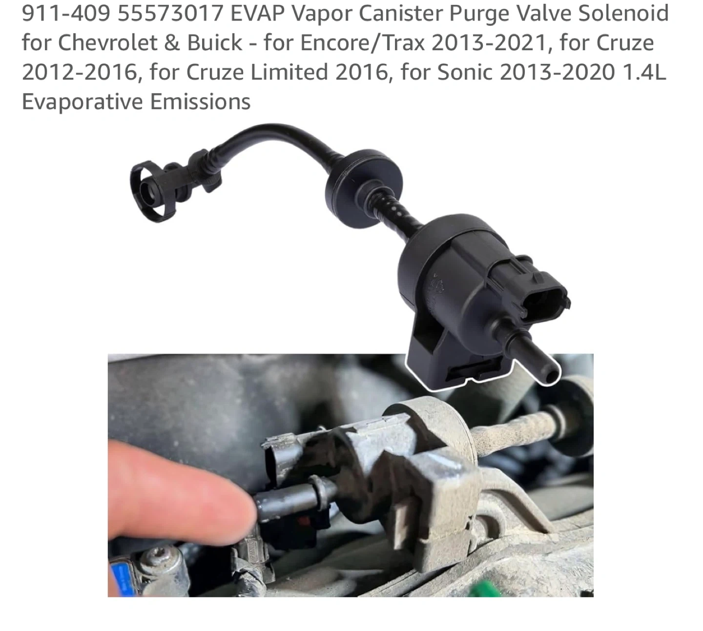 15Vapor Canister Purge Valve. This is the GM Original Equipment part, number 55573017. It's compatible with several Chevrolet and Buick models including Encore/Trax (2013-2021), Cruze (2012-2016), Cruze Limited (2016), and Sonic (2013-2020) 1.4L Evaporative Emissions.