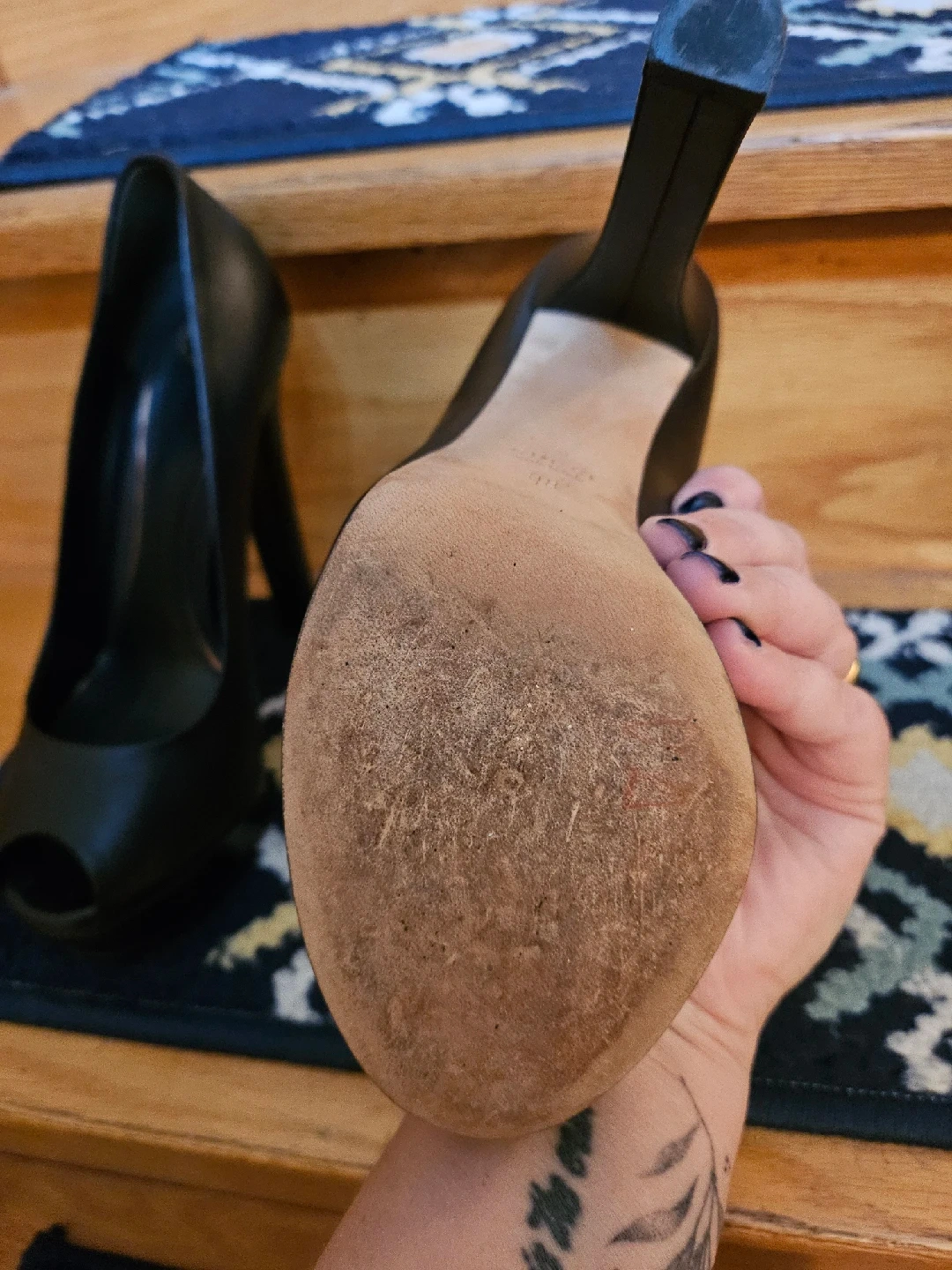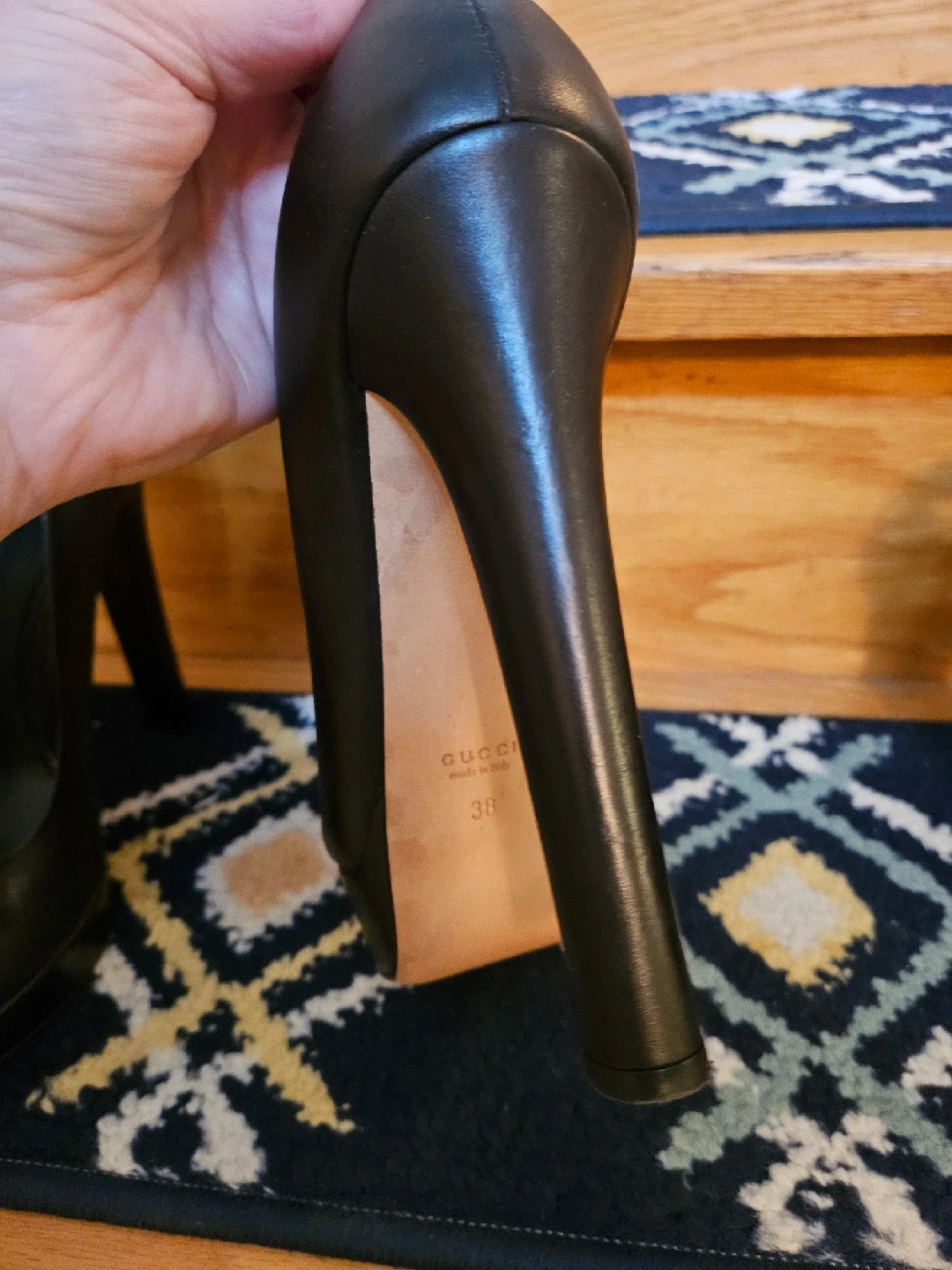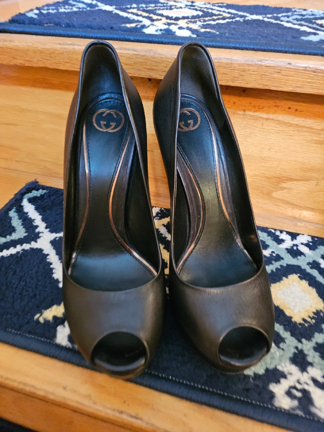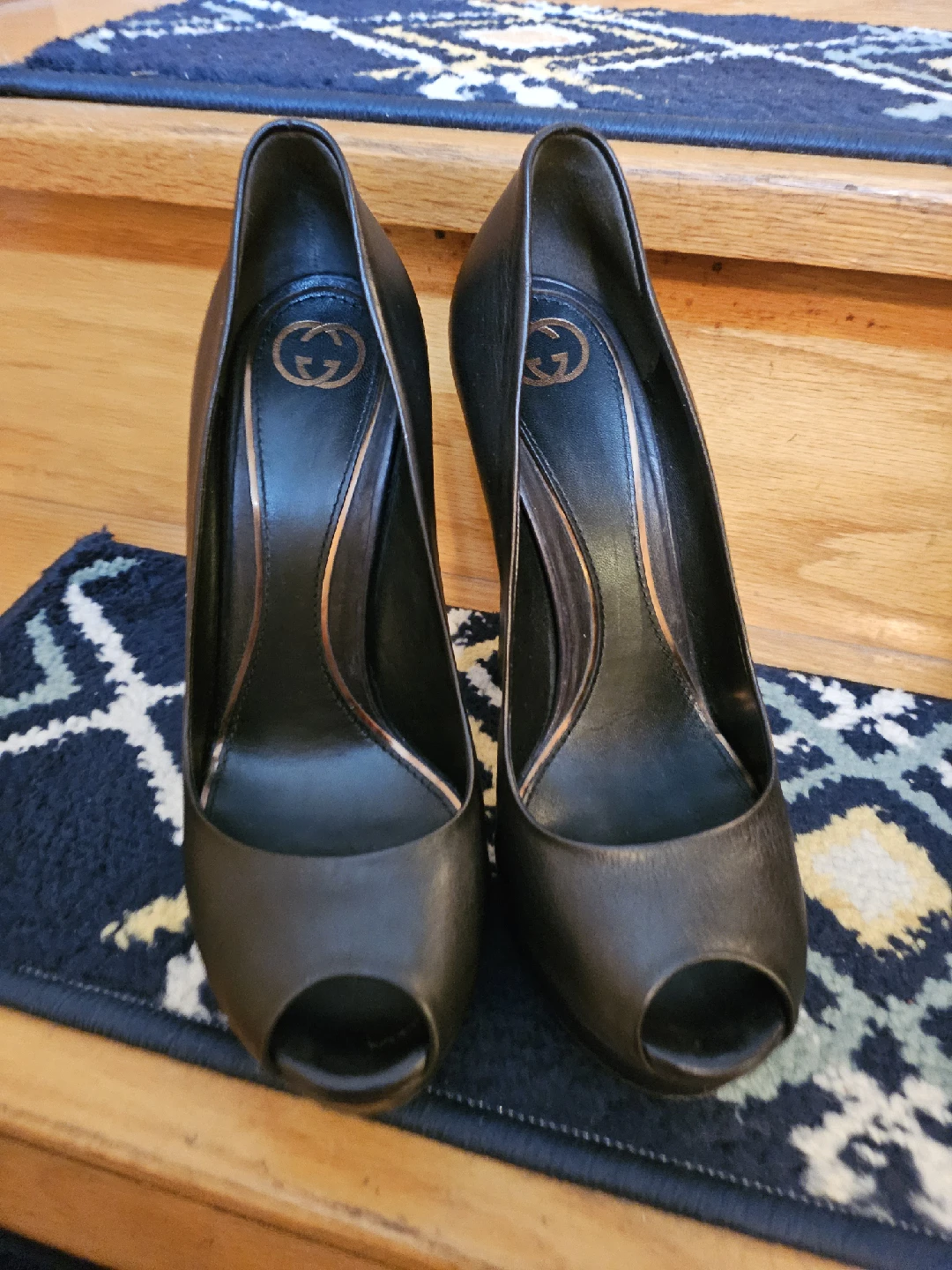 Selling a pair of Gucci black leather peep toe heels. They are a size 8 (marked as 38 on the shoe). There are some signs of wear, as shown in the pictures.Made in italy
