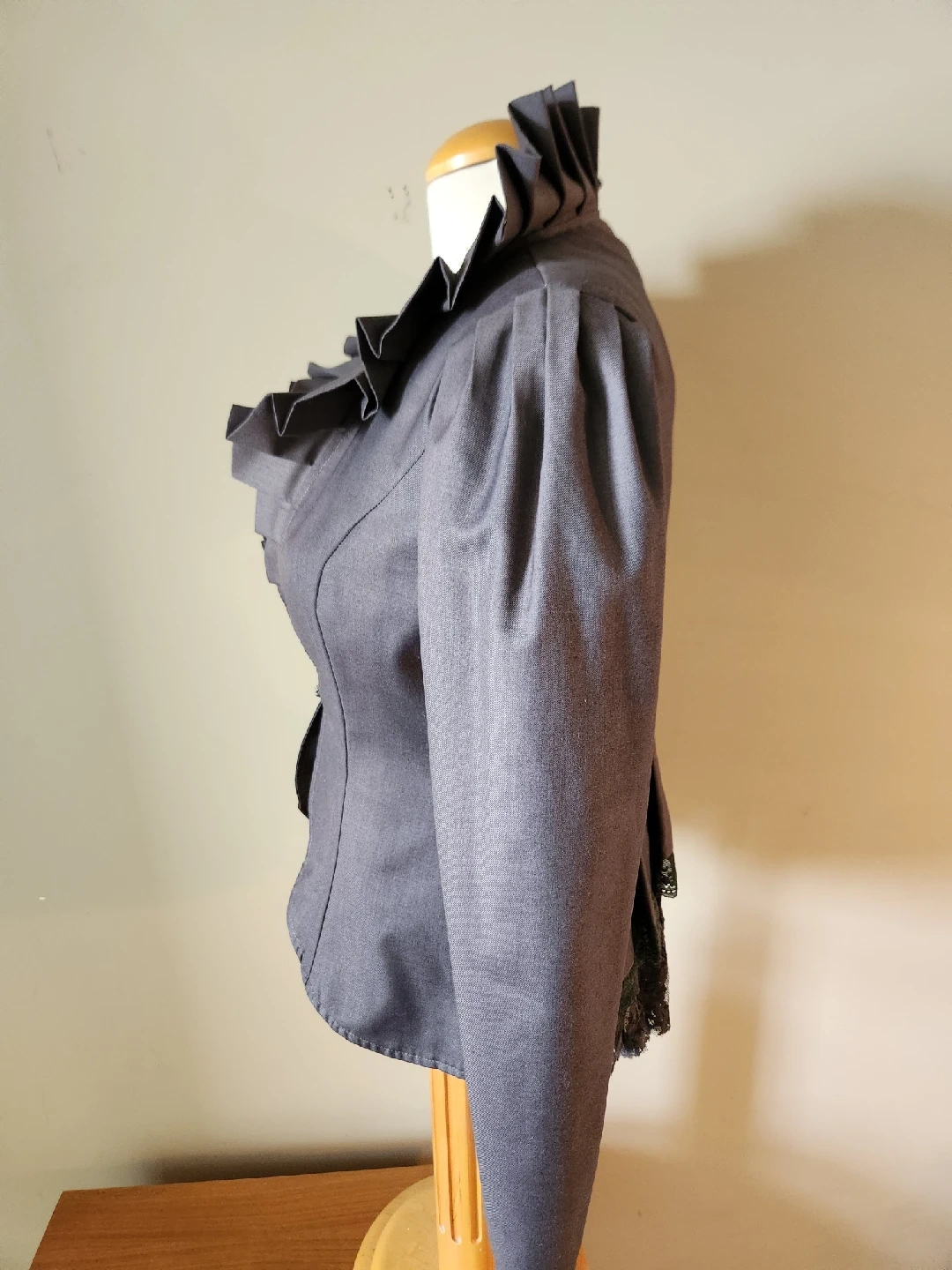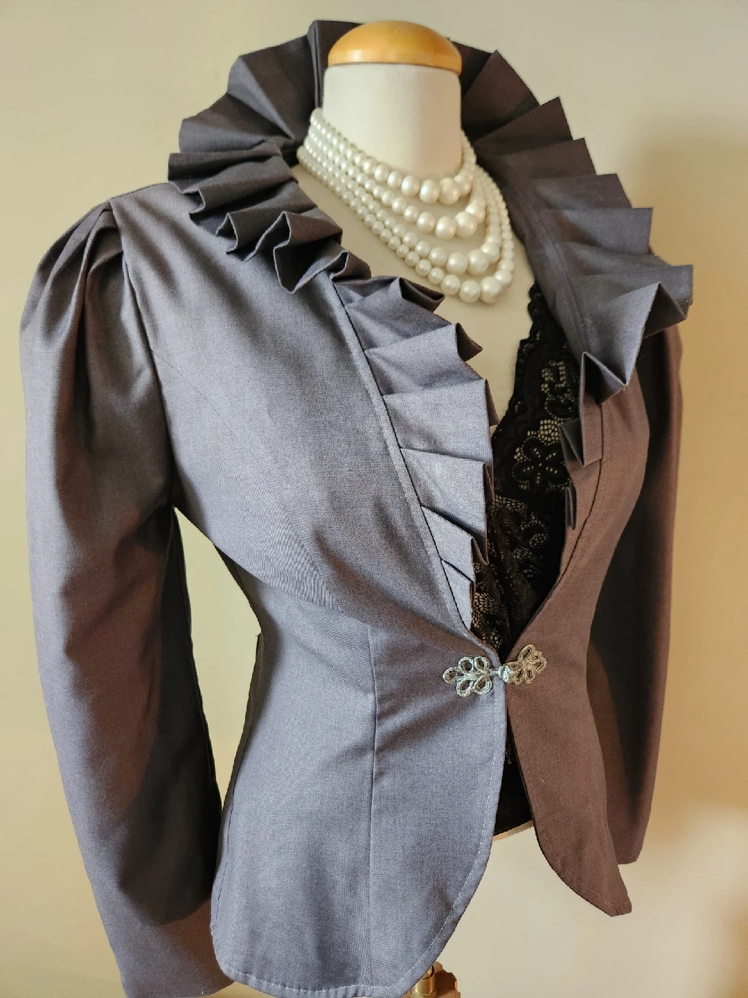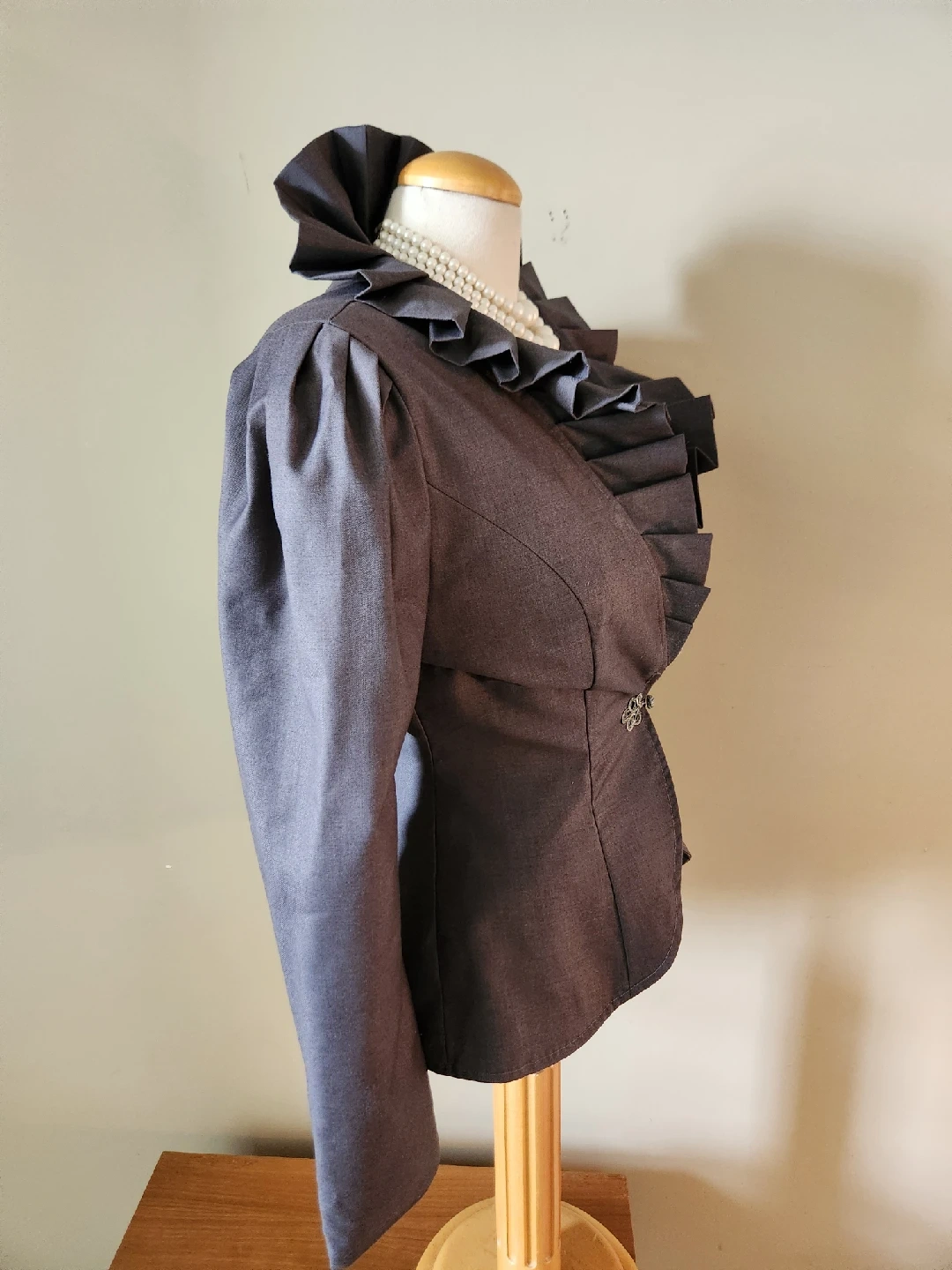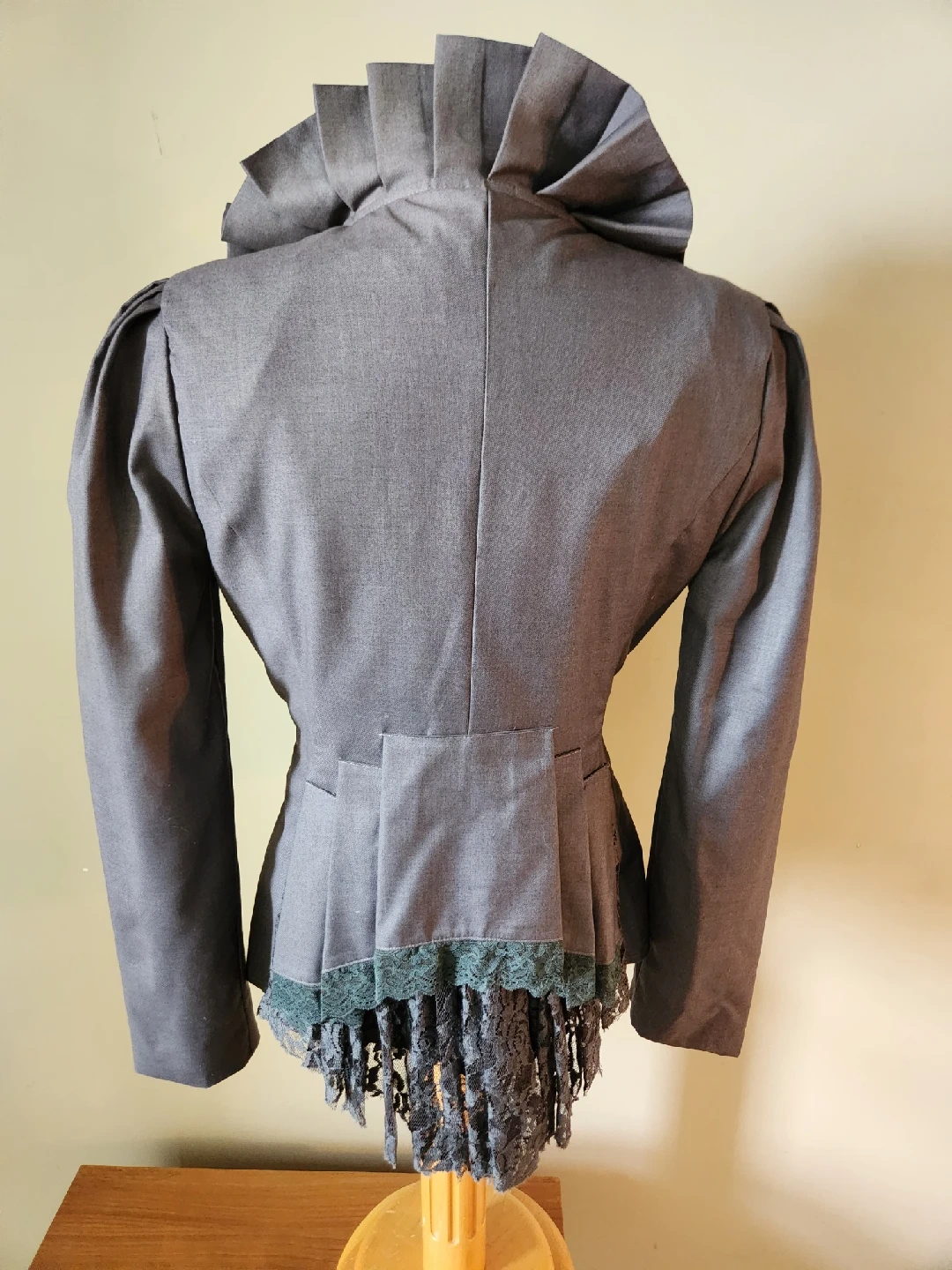 A stylish grey jacket with a unique ruffled collar design, and back bustle feature is delightful It's in great condition and ready to add a touch of elegance to your wardrobe size small - smaller medium. On all Hollows Eve cast a very Victorian visage!