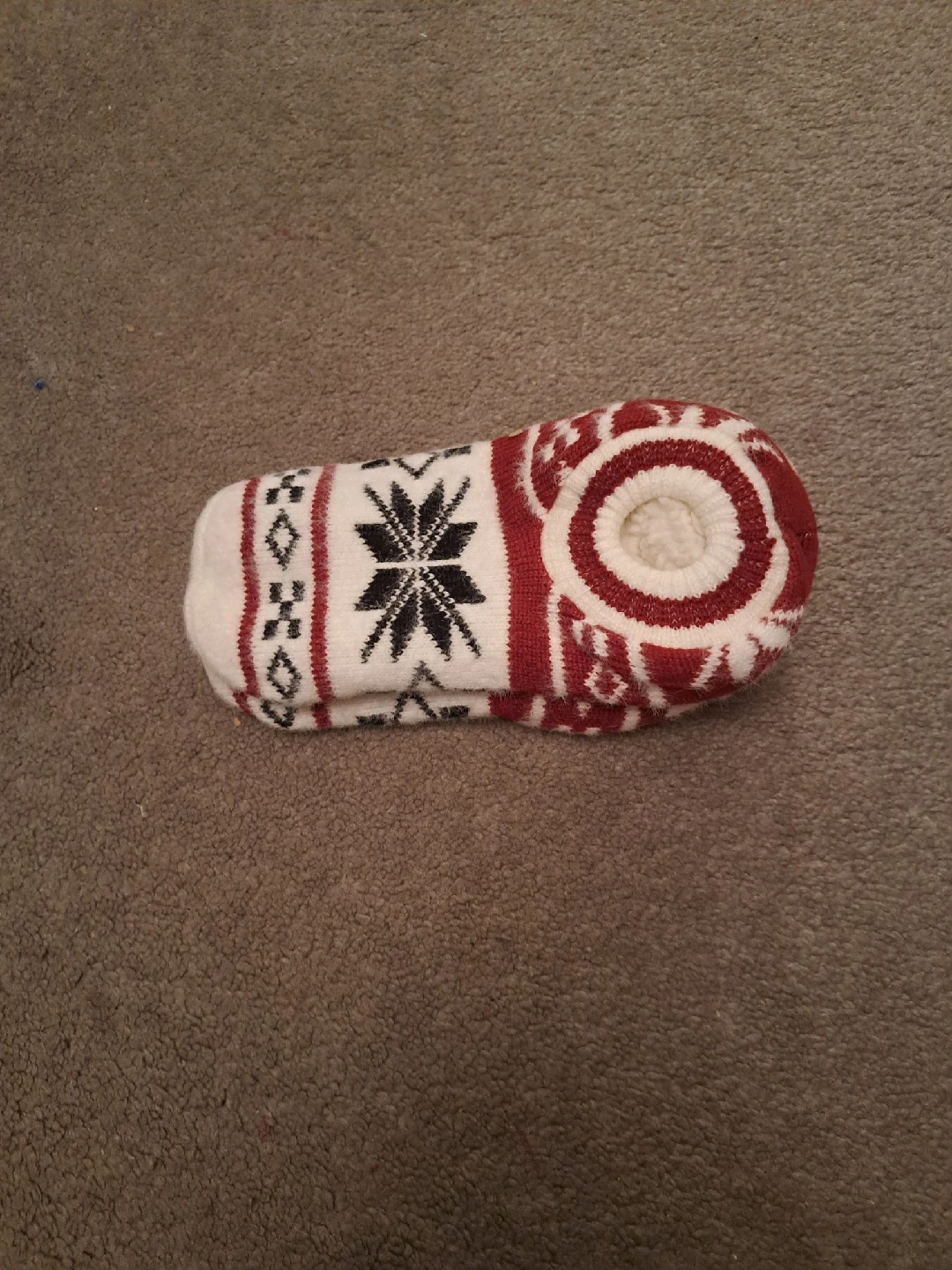 Keep your feet warm and cozy with these slipper socks! They feature a festive pattern in red, white, and black. Perfect for lounging around the house on chilly days