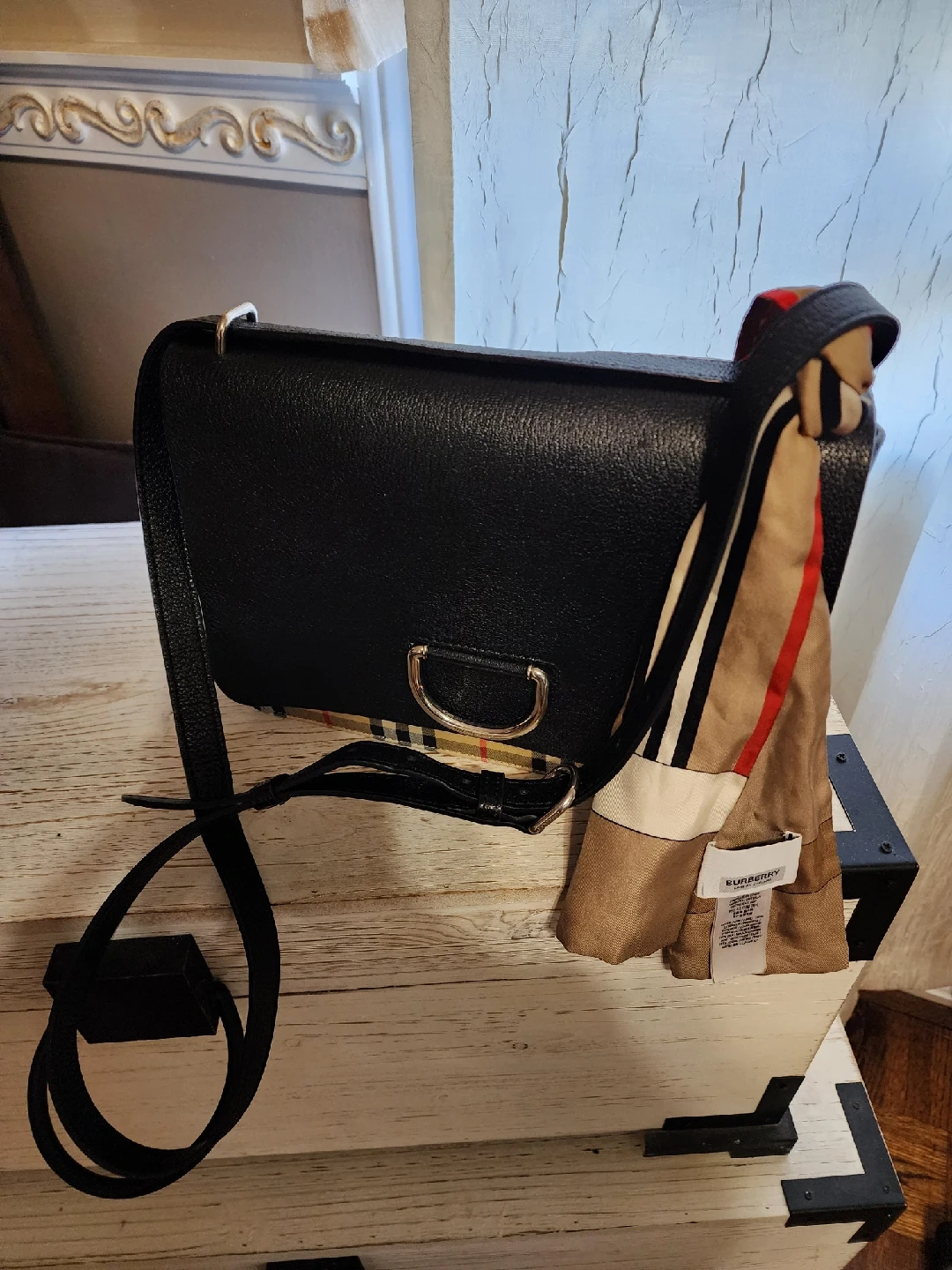 Selling a stylish Burberry black leather crossbody bag! It's in great condition and ready for a new home. The bag features a sleek design with a detachable scarf.