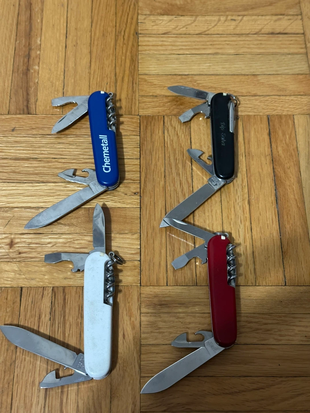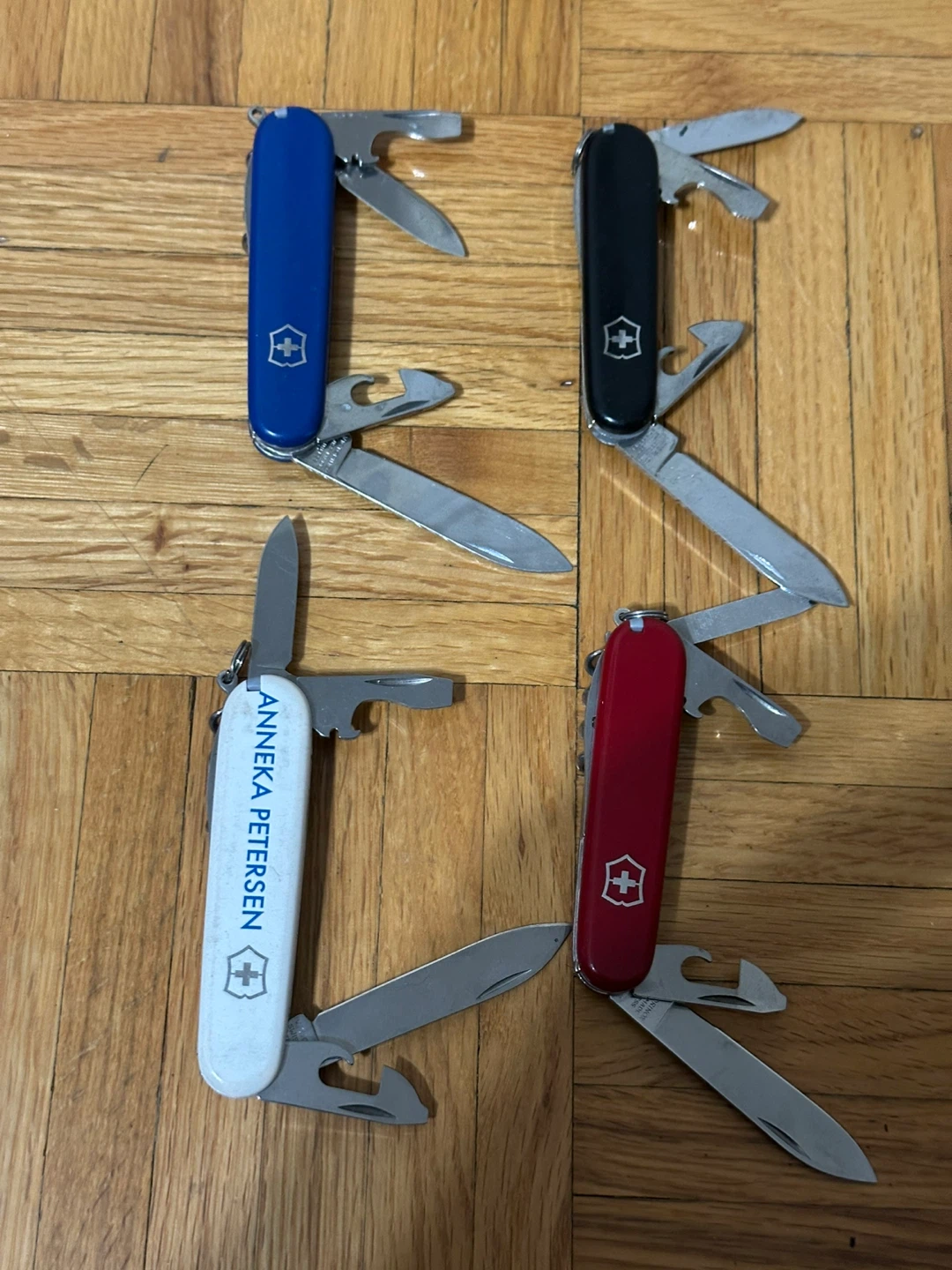 Selling a lot of four Swiss Army knives by Victorinox. They come in blue, black, white and red. Each one has personalized text on the handle.