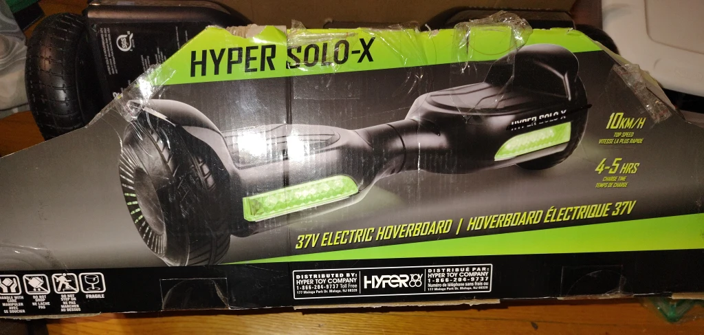 Selling a Hyper solo Company Solo-X electric hoverboard. It comes with the original box. It has a top speed of 10km/h and a charge time of 4-5 hours. It is a 37V electric hoverboard. needs new battery