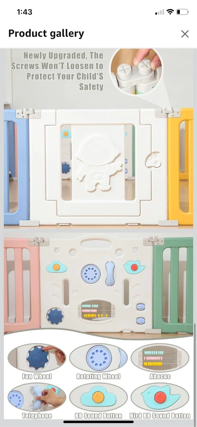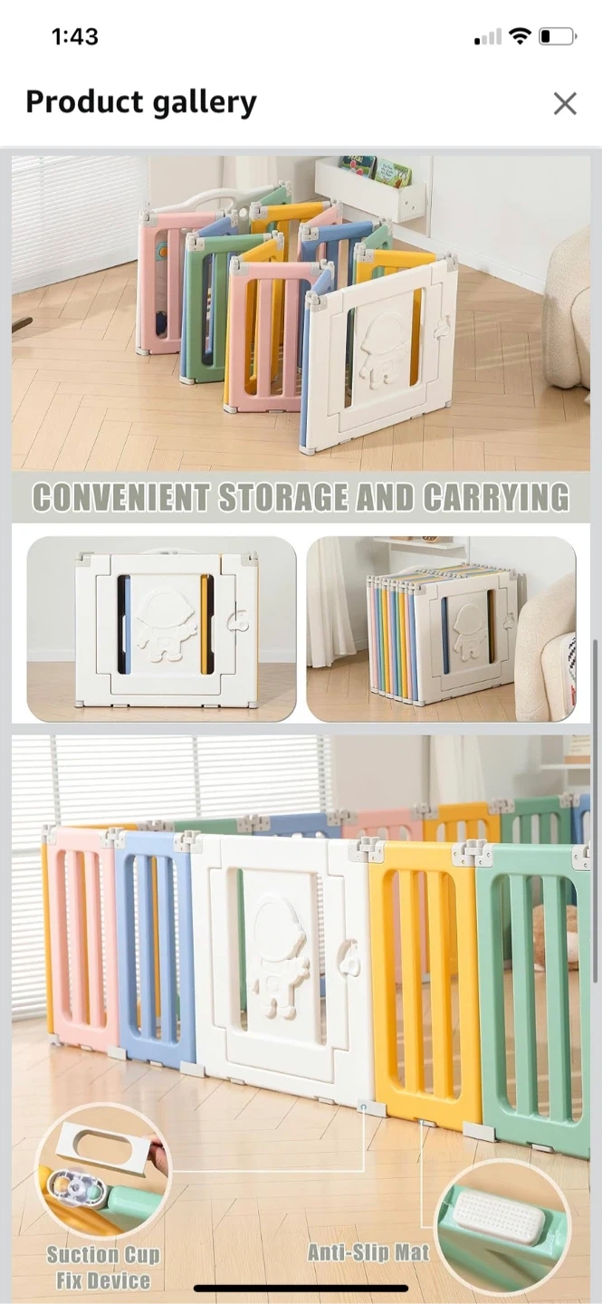 Stable Design: The baby gate playpen features a sturdy design that prevents easy movement by the baby. Moreover, all parts are securely attached, eliminating the risk of accidental ingestion.
