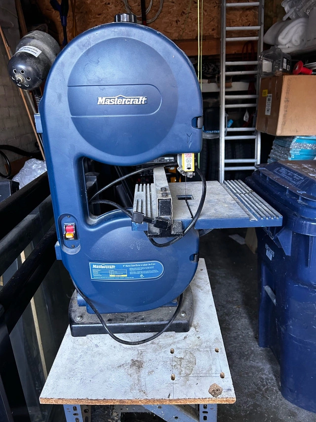 This is a Mastercraft 9" band saw in used condition. It's ready to tackle your woodworking projects! Perfect for cutting intricate shapes and straight lines with precision. This reliable tool will be a great addition to your workshop. Table included.