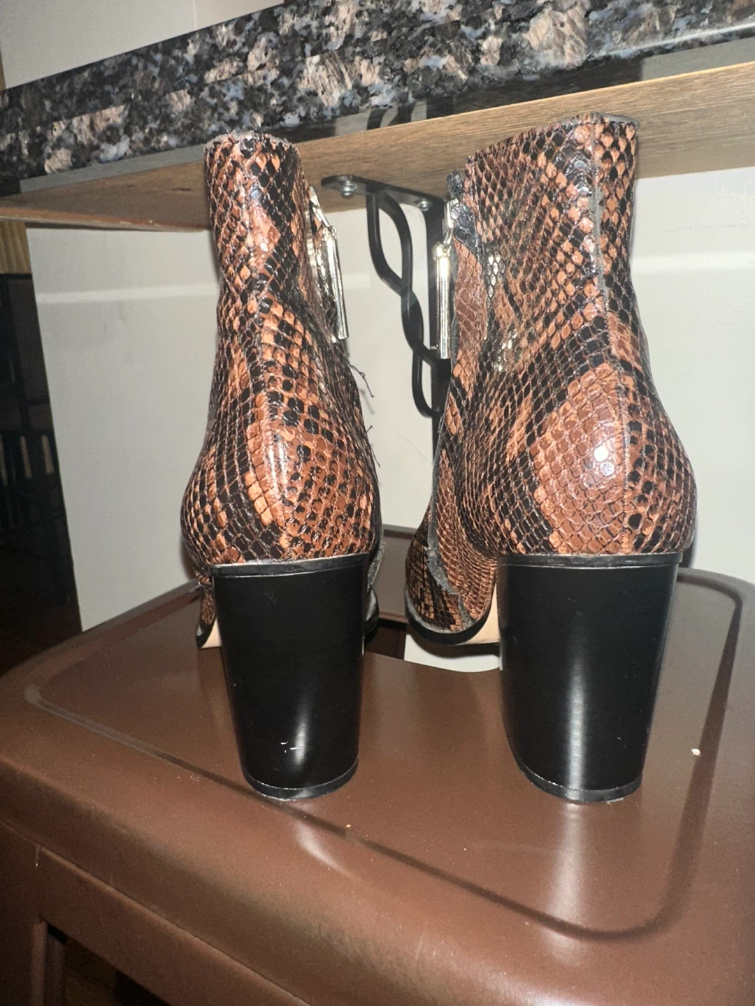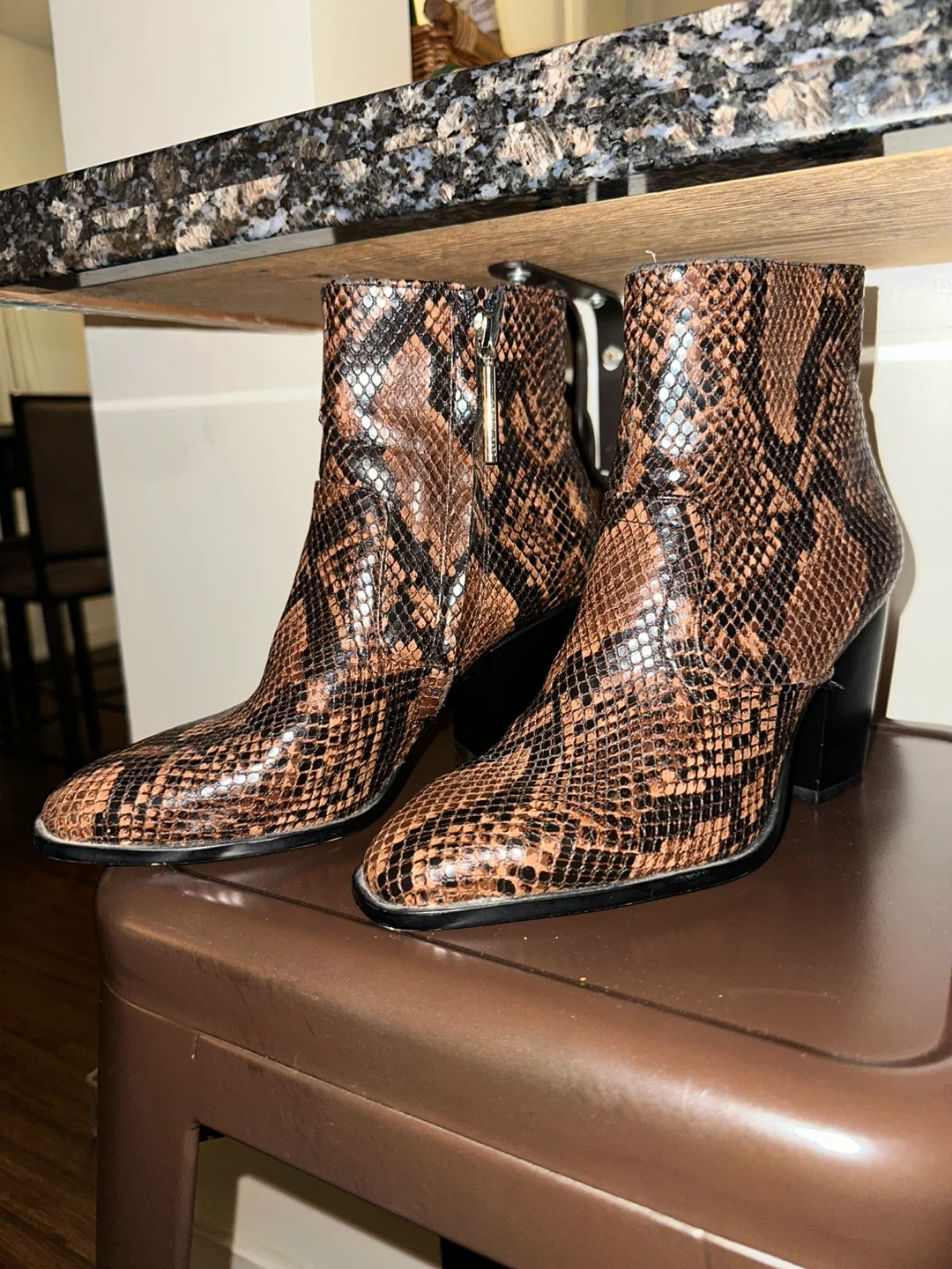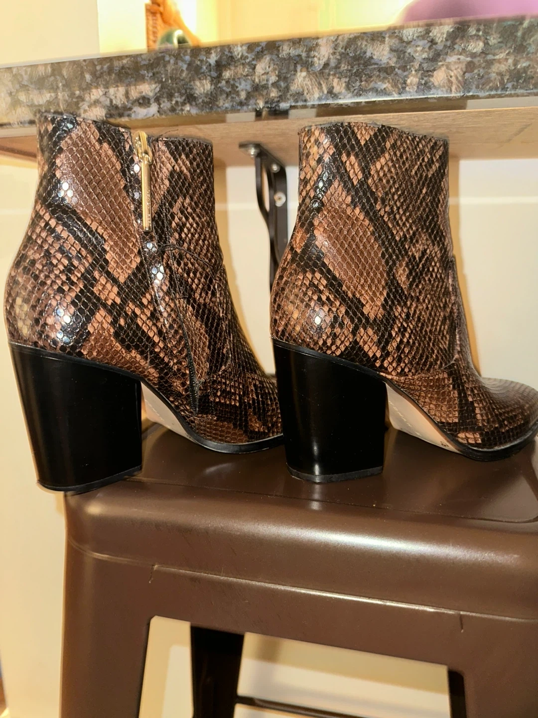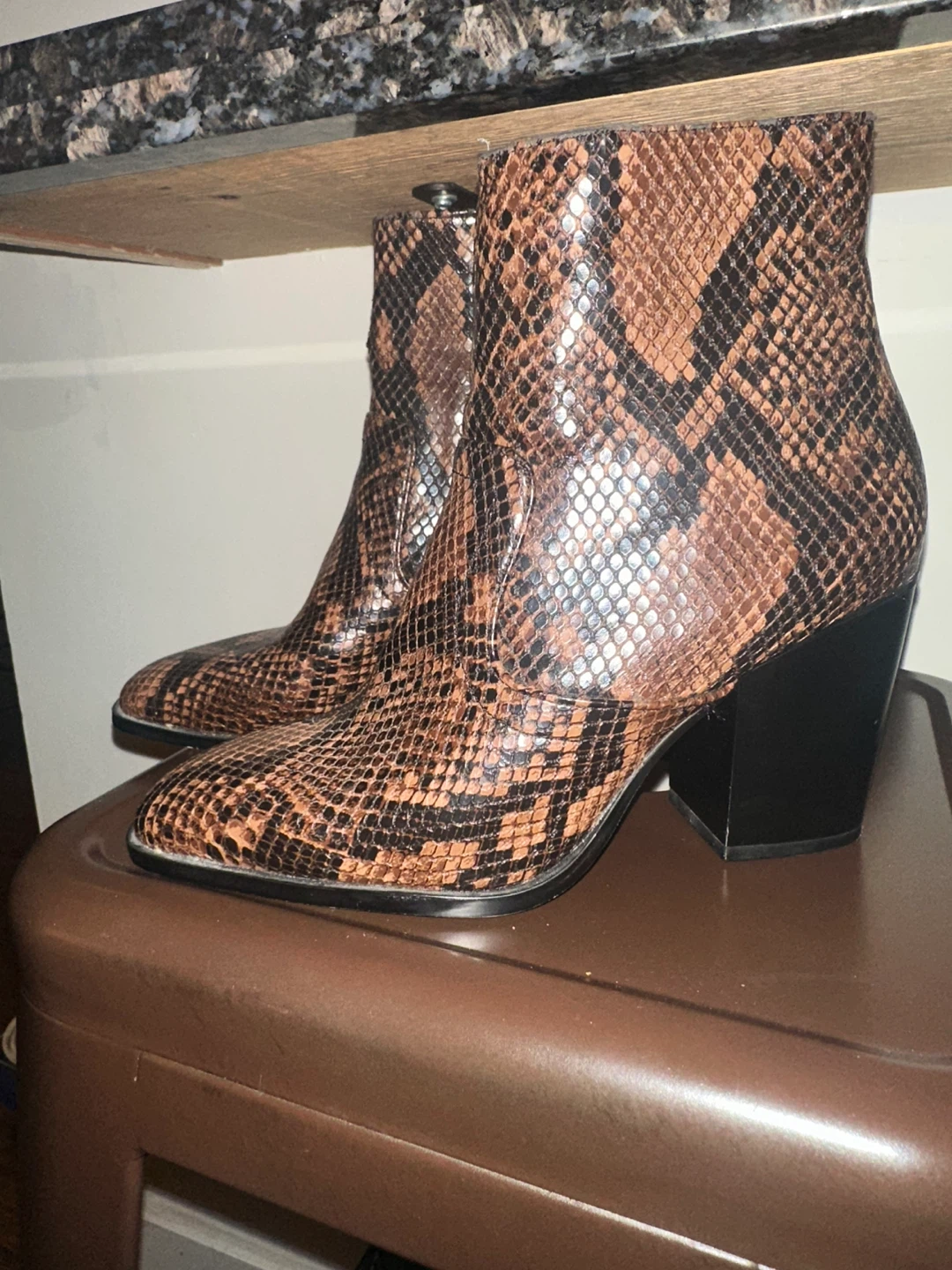These stylish ankle boots feature a brown snakeskin pattern and a comfortable heel. Perfect for adding a touch of flair to any outfit!