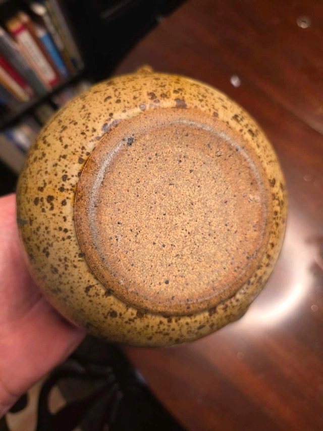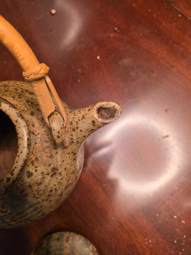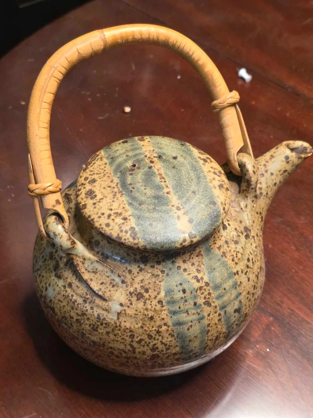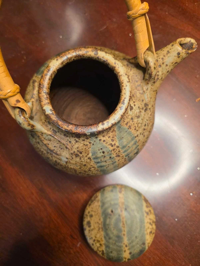 I'm selling a charming handmade ceramic teapot, perfect for tea lovers. Pours perfectly and is extremely well crafted. This unique teapot features a beautiful speckled glaze and a sturdy bamboo handle. It's in good condition, showing slight signs of use, which adds to its rustic appeal. This teapot is not just a functional item but also a piece of art. * Material: Ceramic * Handle: Bamboo * Capacity: About 4 cups. I'm pricing this one at $45 due to its lovely design and very good condition. If the ad's up, it's up for grabs!