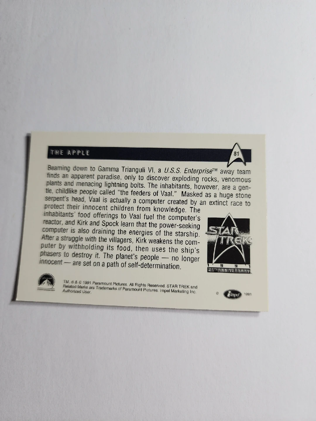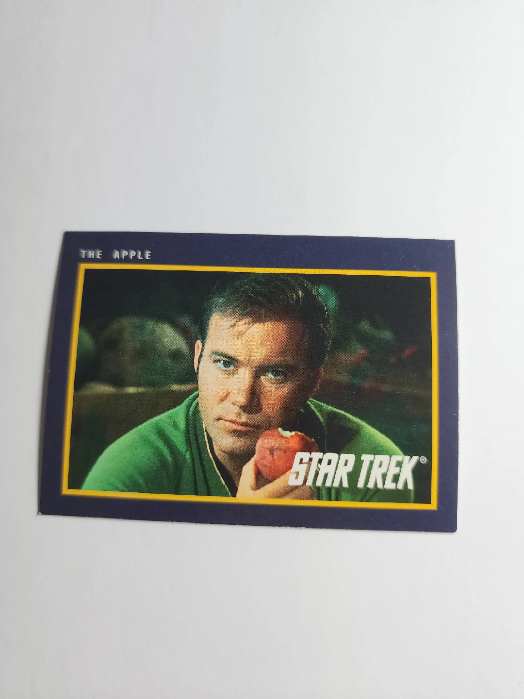 Selling a Star Trek trading card titled 'The Apple'. It's in great condition and features Captain Kirk! A cool collectible for any Star Trek fan