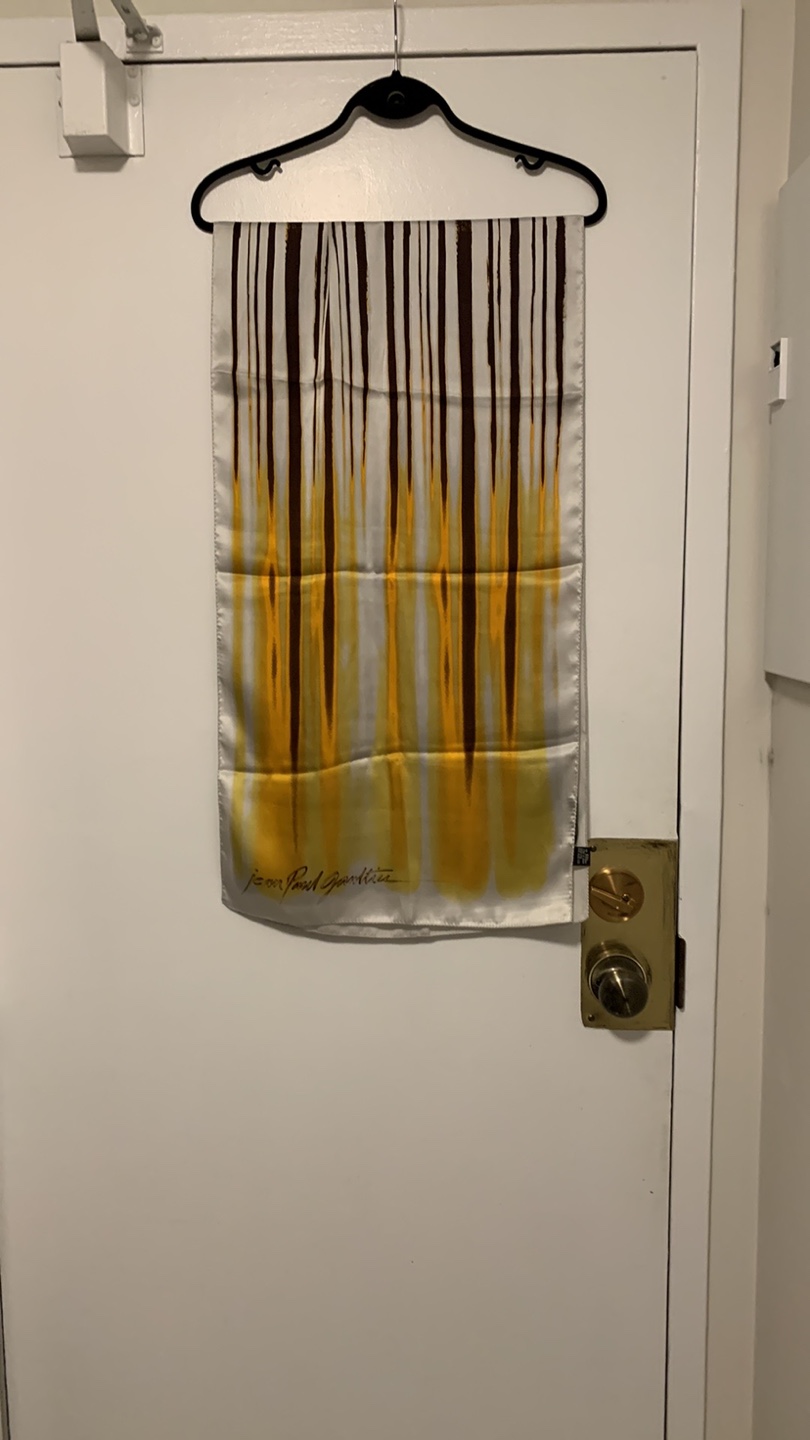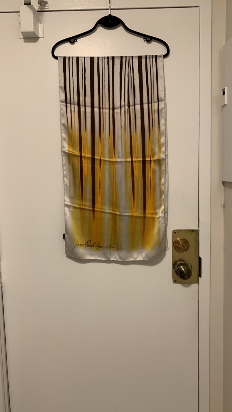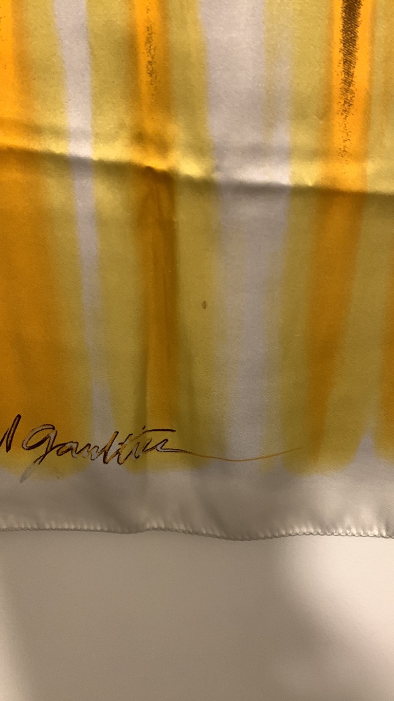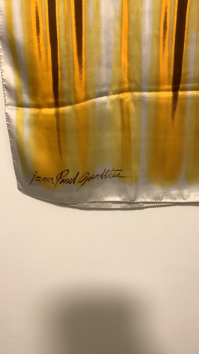 Here's a Jean Paul Gaultier scarf. It has a unique design with brown and yellow accents on a white background. Perfect for adding a touch of style to any outfit!