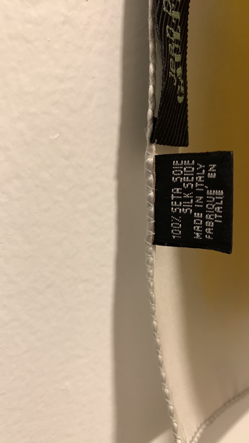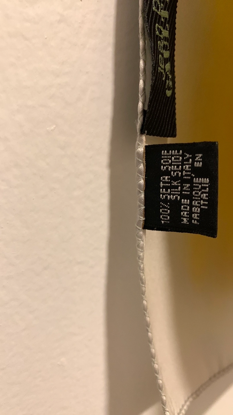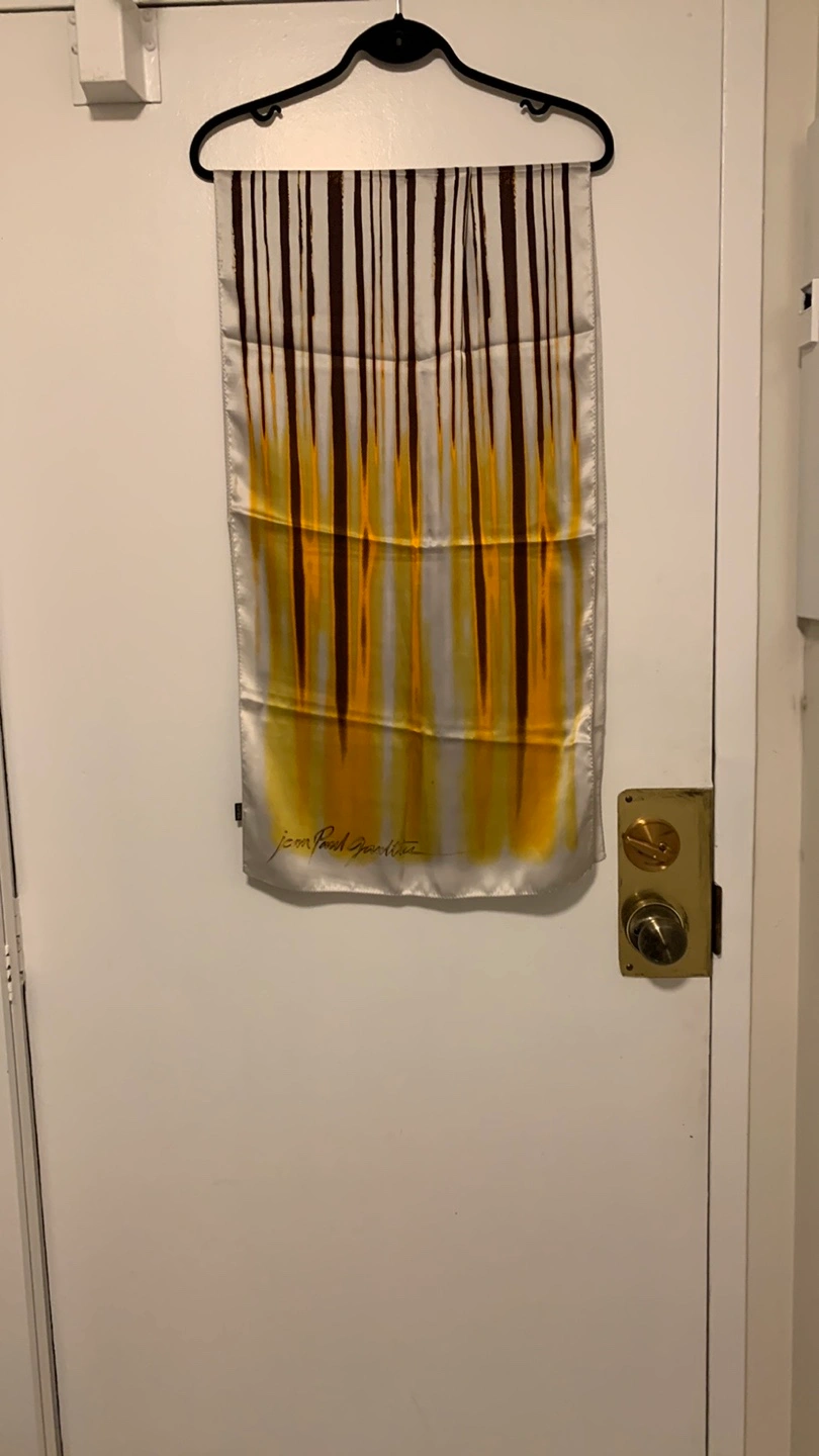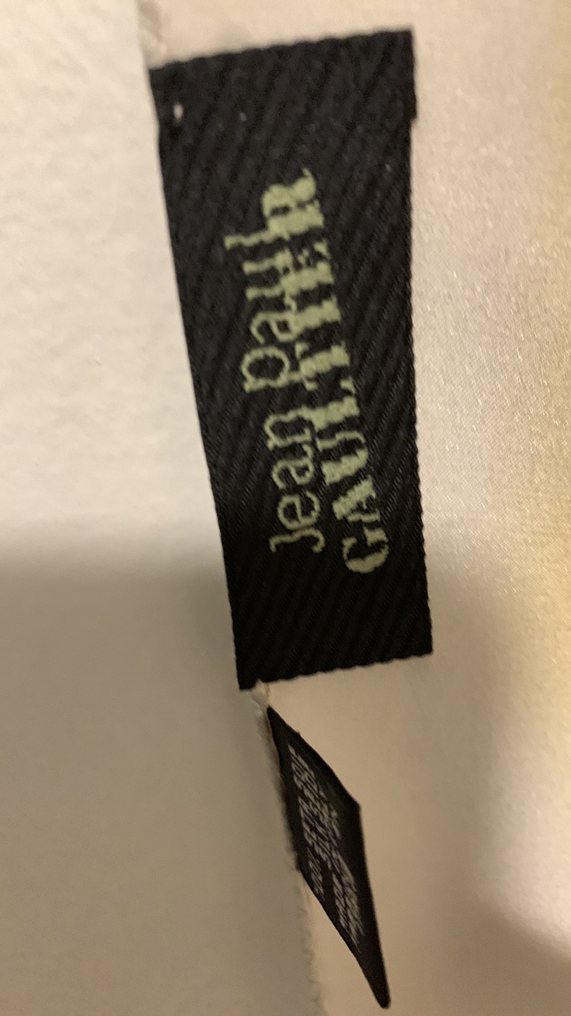 Here's a Jean Paul Gaultier scarf. It has a unique design with brown and yellow accents on a white background. Perfect for adding a touch of style to any outfit!