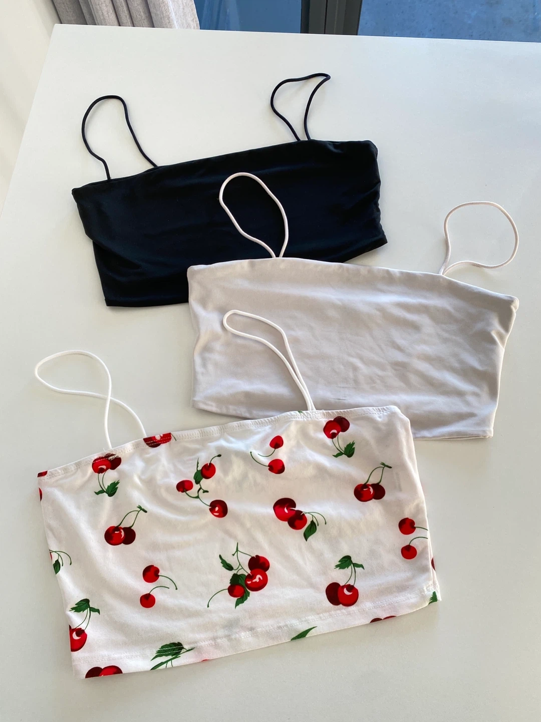 Selling a set of 3 cute tops! There's one in black, one in white, and another with a cherry print. They're in great condition and ready for a new home. You can pair them with anything, wear on their own or create different styles with layering!