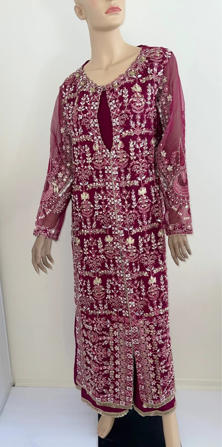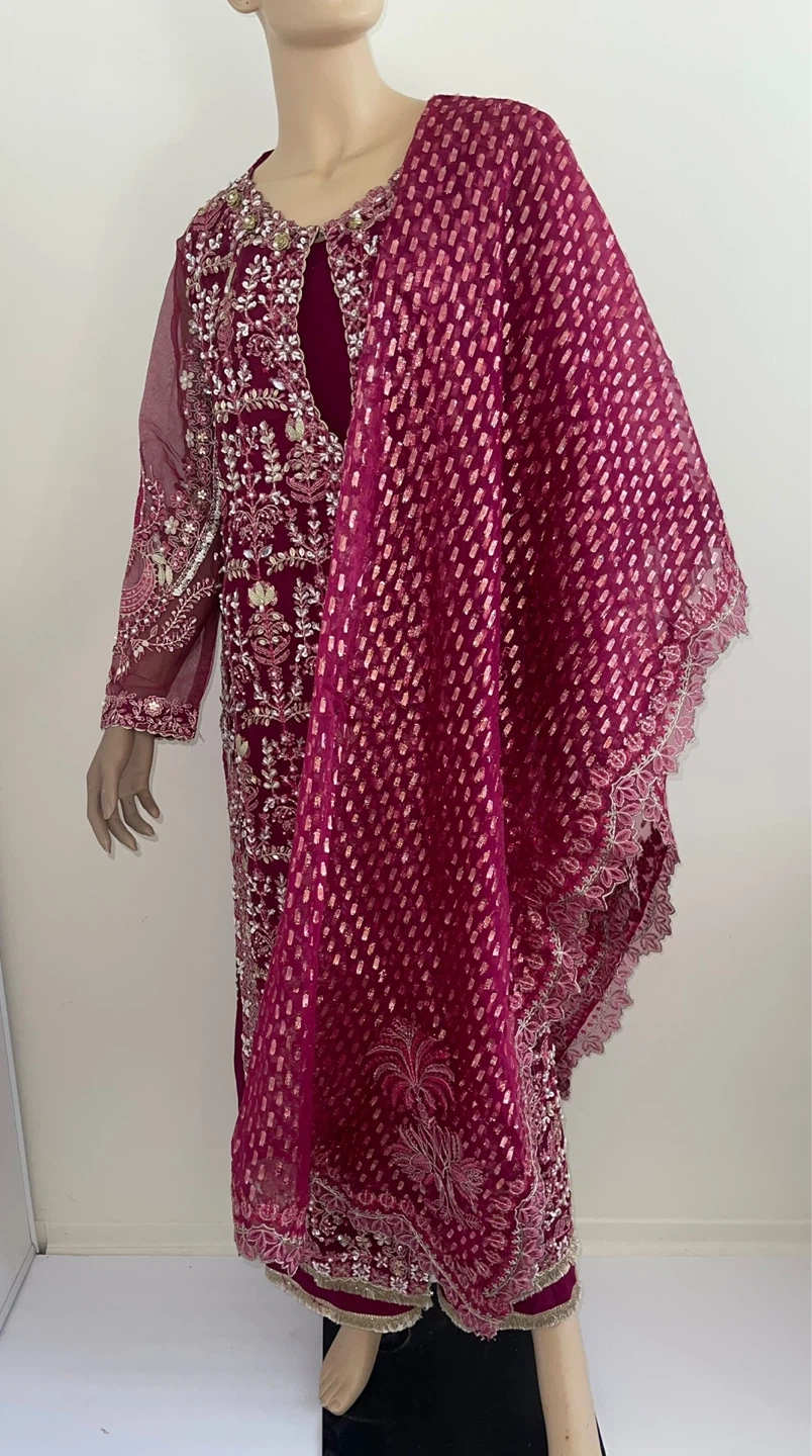 Beautiful Pakistani Indian magenta 3 piece suit with intricate heavy pearl and gems embroidery! It comes with a matching dupatta and trousers. Perfect for a special occasion!