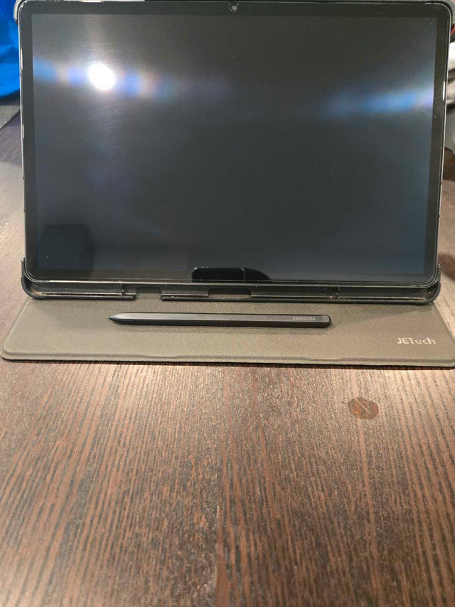 In excellent shape, has a glass screen protector on it from day 1 and always in a spigen case. 256gb storage and 8 gb ram, beautiful large 12.4 inch amoled screen. Comes with the s-pen and a 65 watt charger and a spigen case. It's a great tablet for YouTube / IPTV / gaming / or as a second screen for your Windows computer. It has a small mark 1 cm by 1mm under the screen protector in the center of the screen, I think it is just moisture. I don't want to take off the screen protector to check it but I am sure it is moisture or dust.