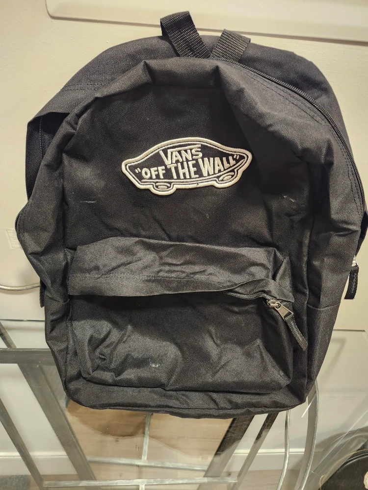 Selling a black Vans backpack! It's in good condition and ready for a new home. The backpack features the classic "Vans Off The Wall" logo. Perfect for school, travel, or everyday use!