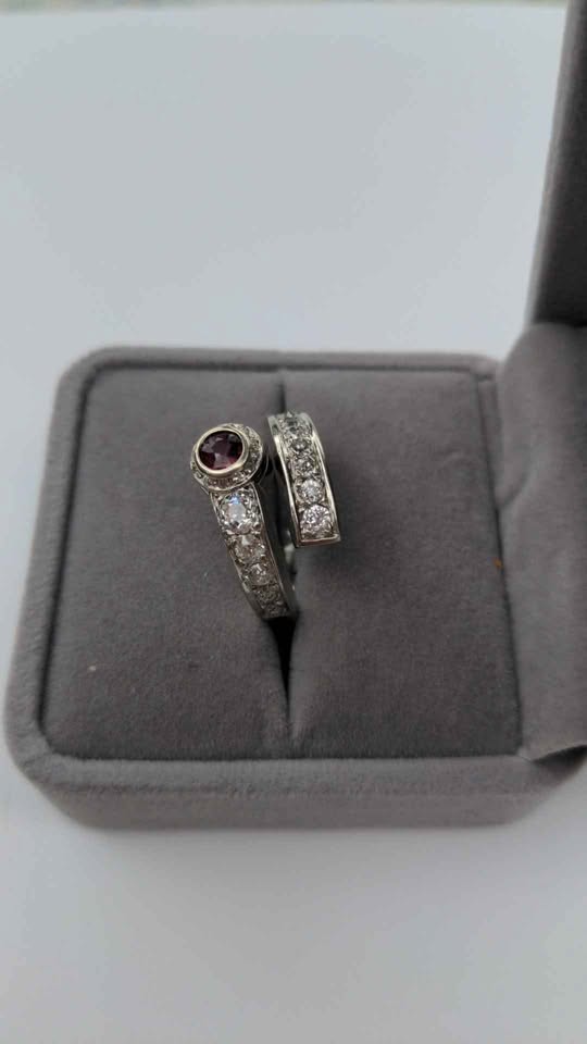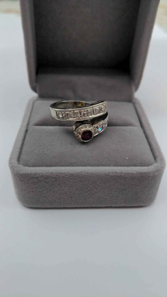 Own a piece of history with this breathtaking British Art Deco ring, crafted circa 1920s in solid 14K white gold. At its heart is a certified ruby, surrounded by a halo of rare old mine cut diamonds—each hand-cut and full of vintage fire. This ring embodies the bold geometry and elegance of the Art Deco era, making it a standout for collectors and connoisseurs alike.