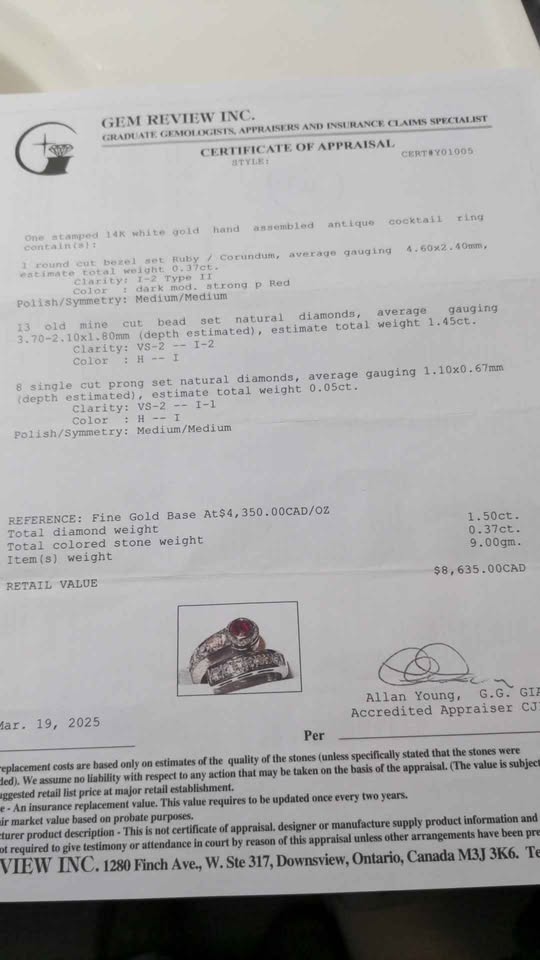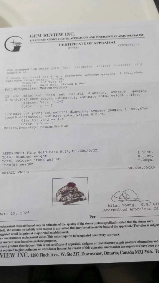 - Appraised Value: $8,635 CAD (Gem Testing Inc., Mar 2025