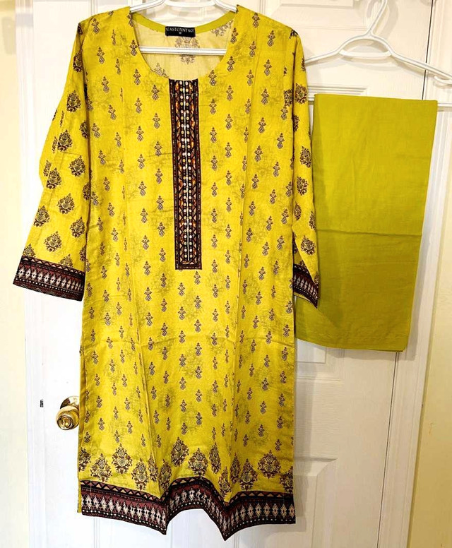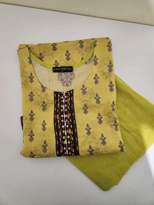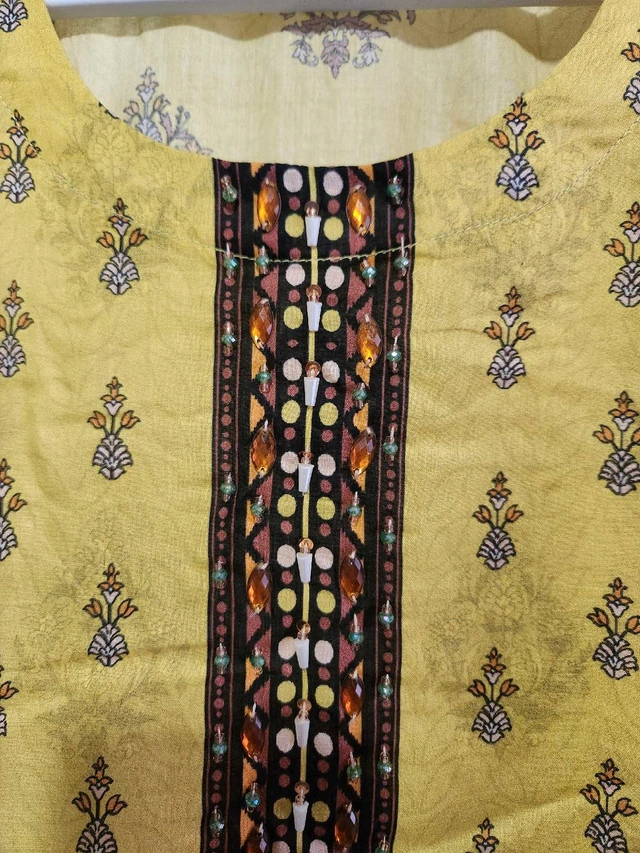Beautiful 2 pcs causal suit with beadswork neckline.