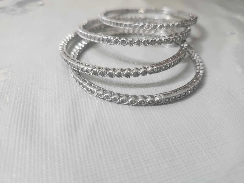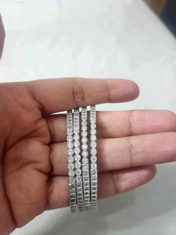 Upgrade your jewelry collection with this stunning set of 4 silver bangles, beautifully studded with sparkling stones. Each bangle features a unique design — from classic round to square-cut stones — giving a perfect blend of style and sophistication. Ideal for special occasions or daily wear! 💎
