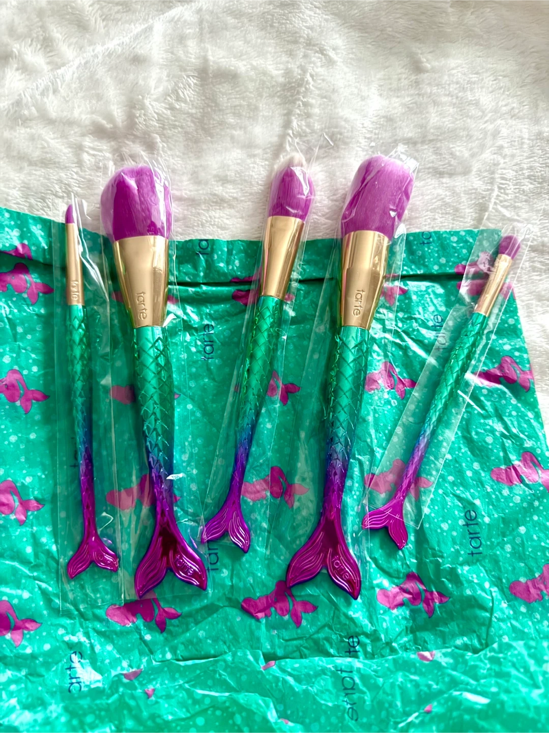 Selling a brand new Tarte Minutes to Mermaid Brush Set! This set includes 5 brushes with unique mermaid-tail handles. The brushes are still in their original packaging and have never been used. Perfect for any makeup enthusiast!