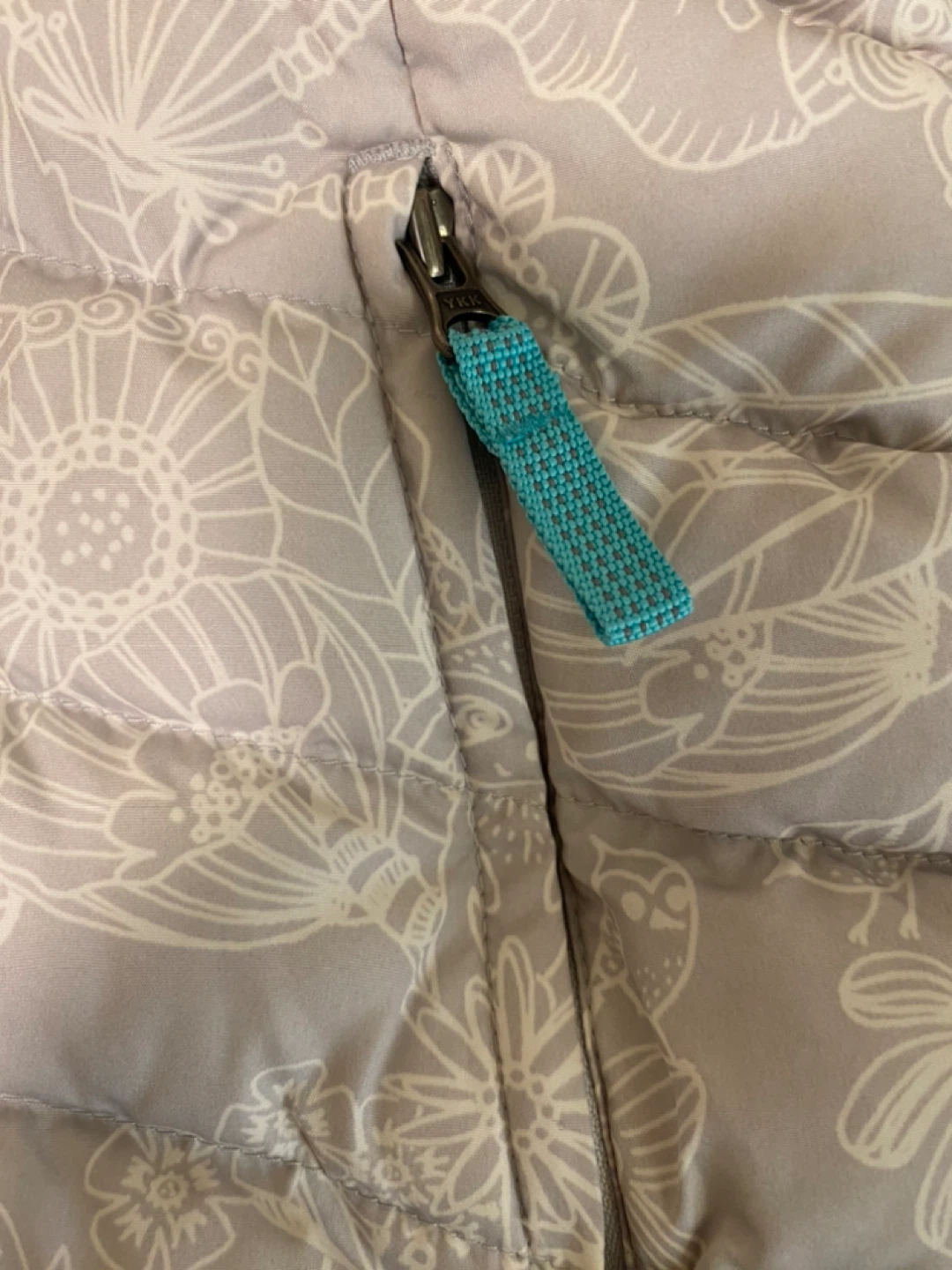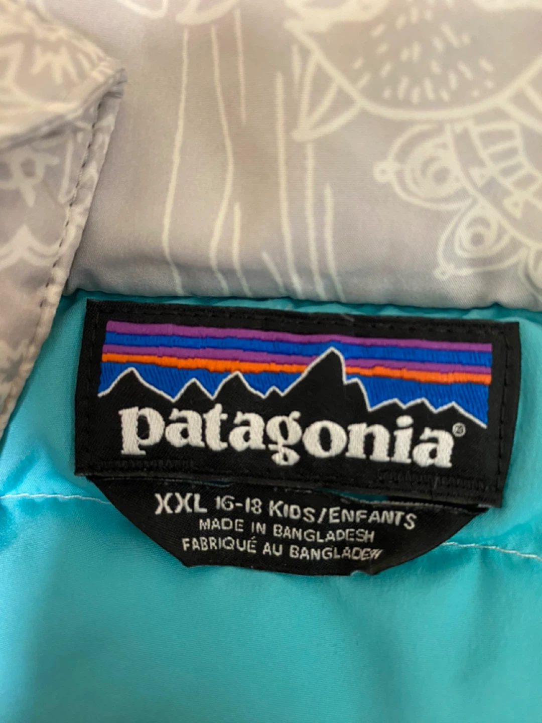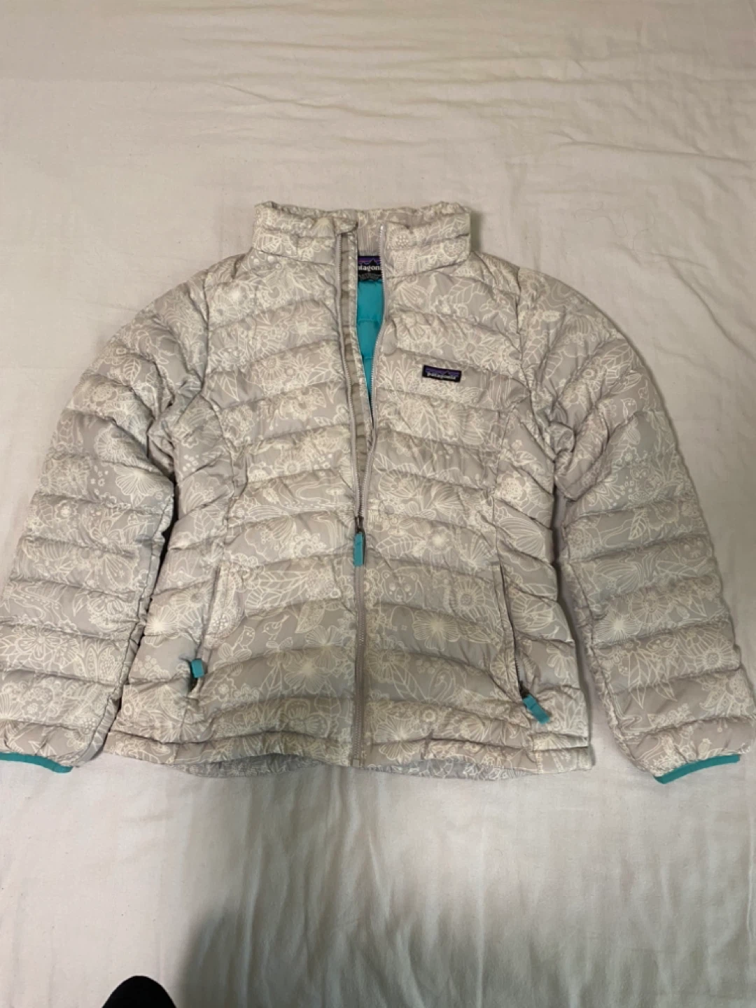 Selling a Patagonia down jacket in excellent condition! It's a kids' size XXL (16-18). The jacket has a beautiful floral pattern and a bright turquoise lining. Perfect for keeping your little one warm and stylish!