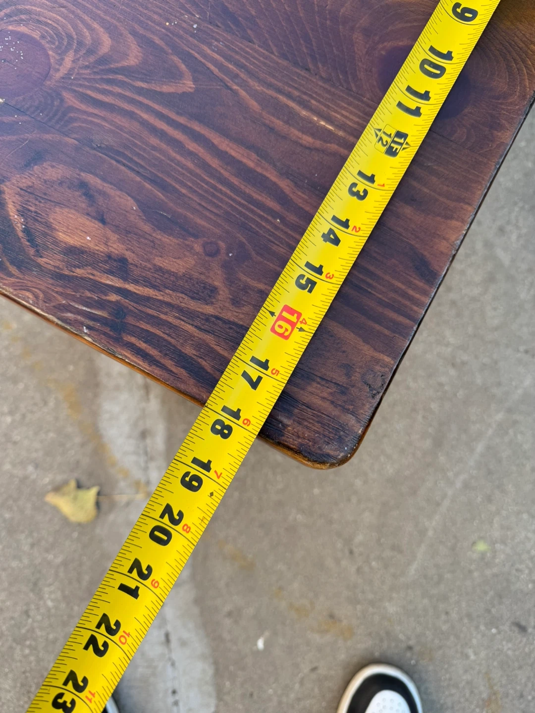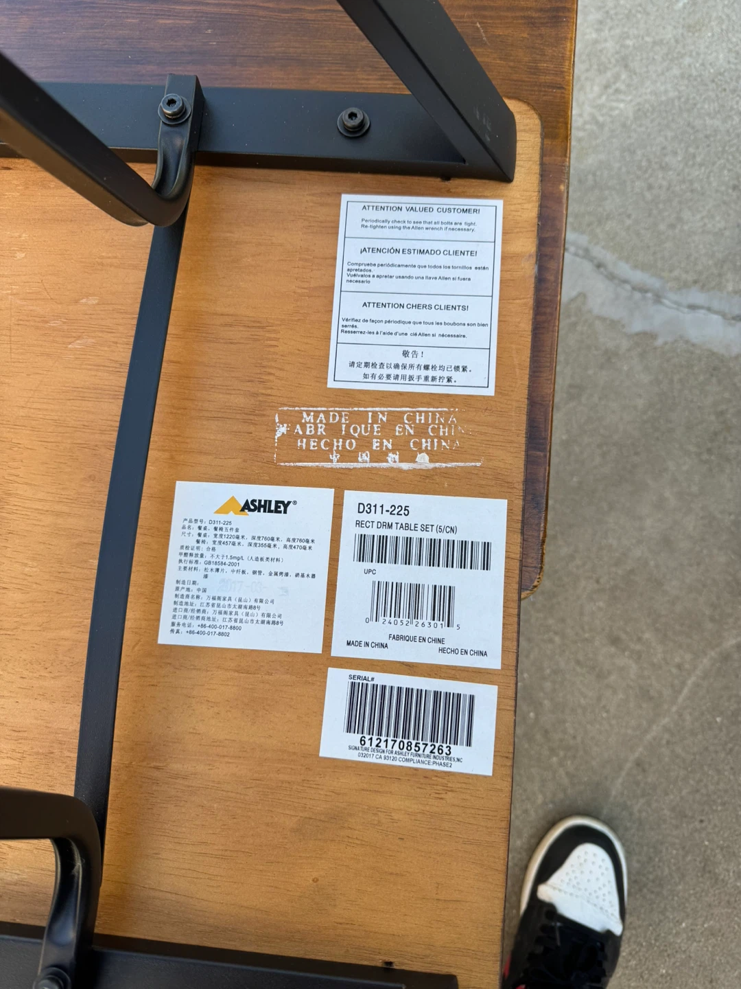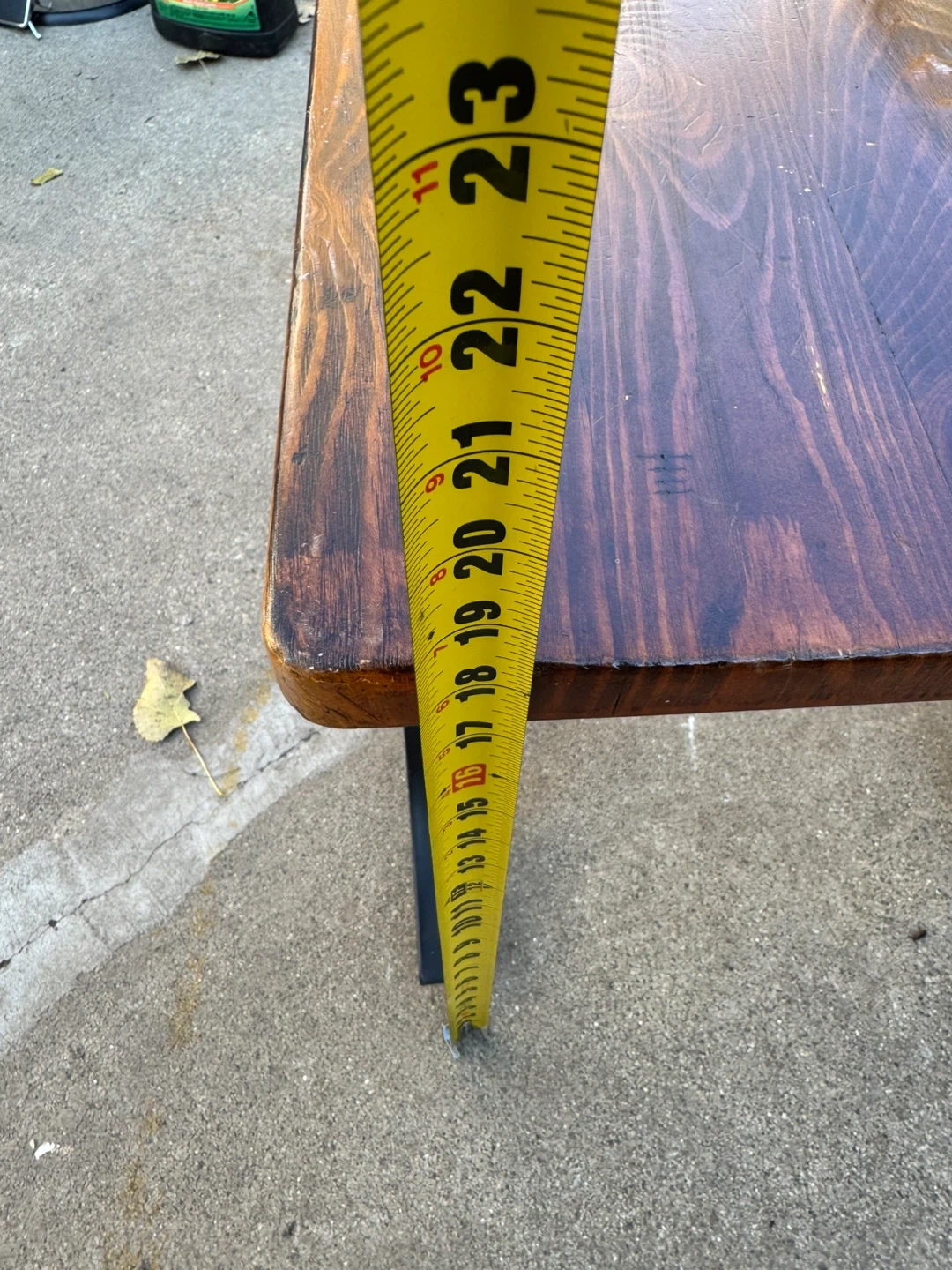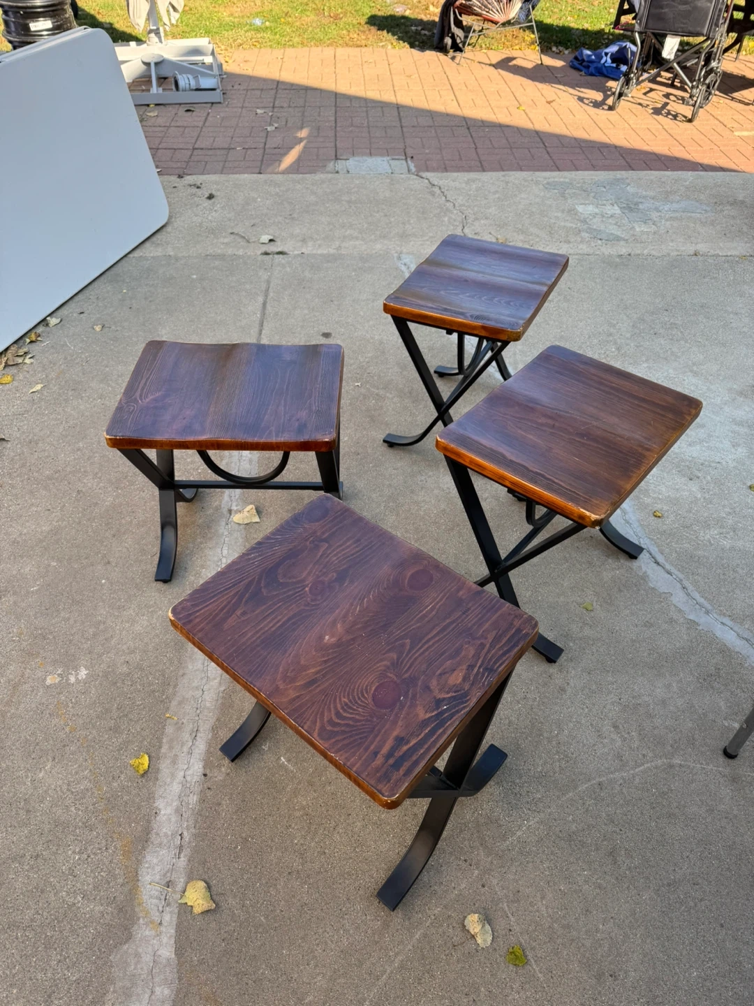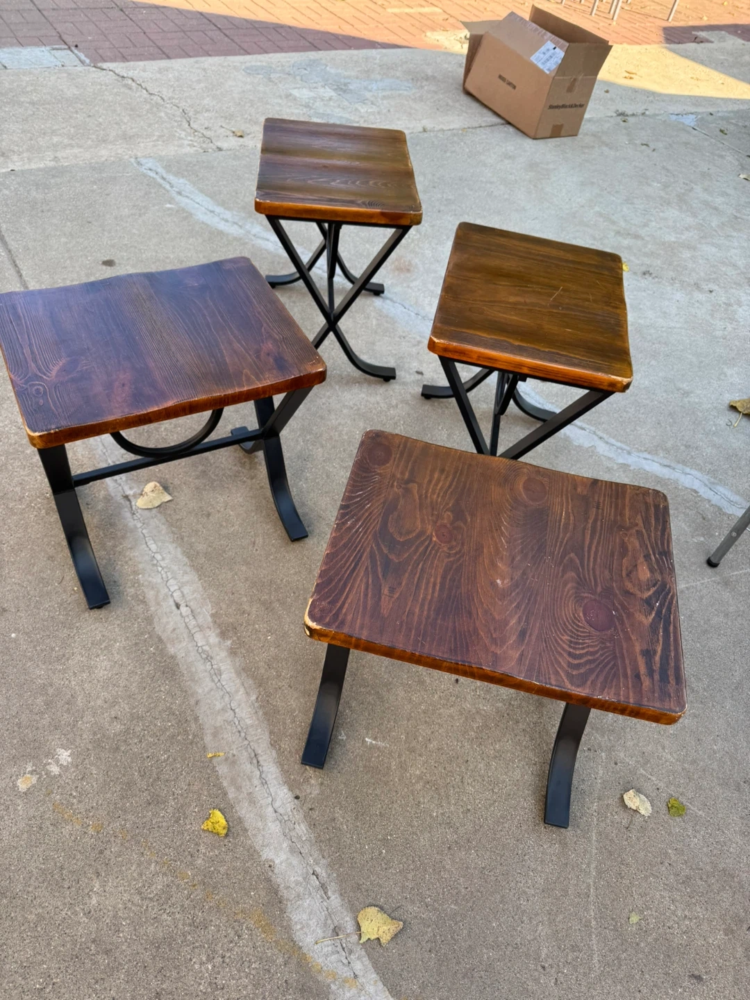 Selling a set of four Ashley D311-225 rectangular accent chair These chair have a dark brown wood top and black metal legs. Each table measures approximately 22 inches in length and width, and 22 inches in height. Perfect for adding a touch of rustic charm to your living space
