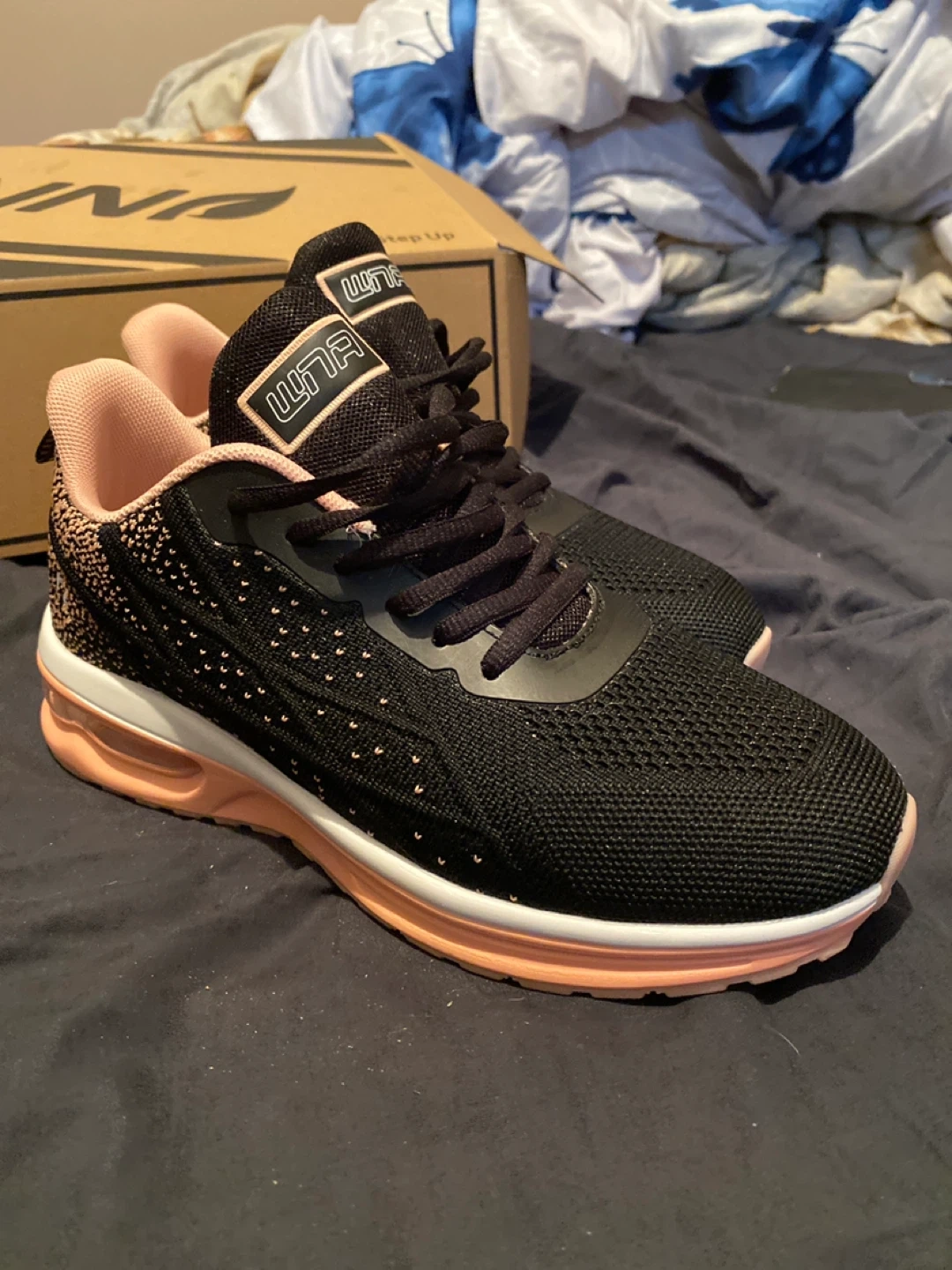 Selling a pair of WNA Air running shoes in black and peach. They are in brand new condition and come with the original box. Perfect for running or everyday wear!