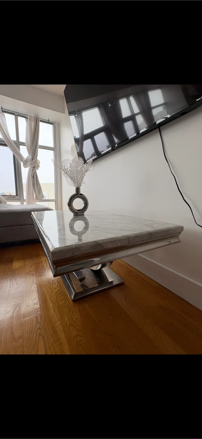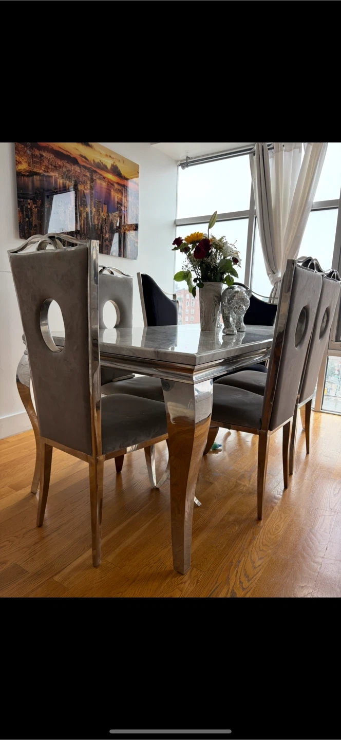Elegant dining table set with 6 chairs. The table features a marble top and a shiny, chrome-like base. The chairs are upholstered in a soft gray fabric. Perfect for a modern dining room!