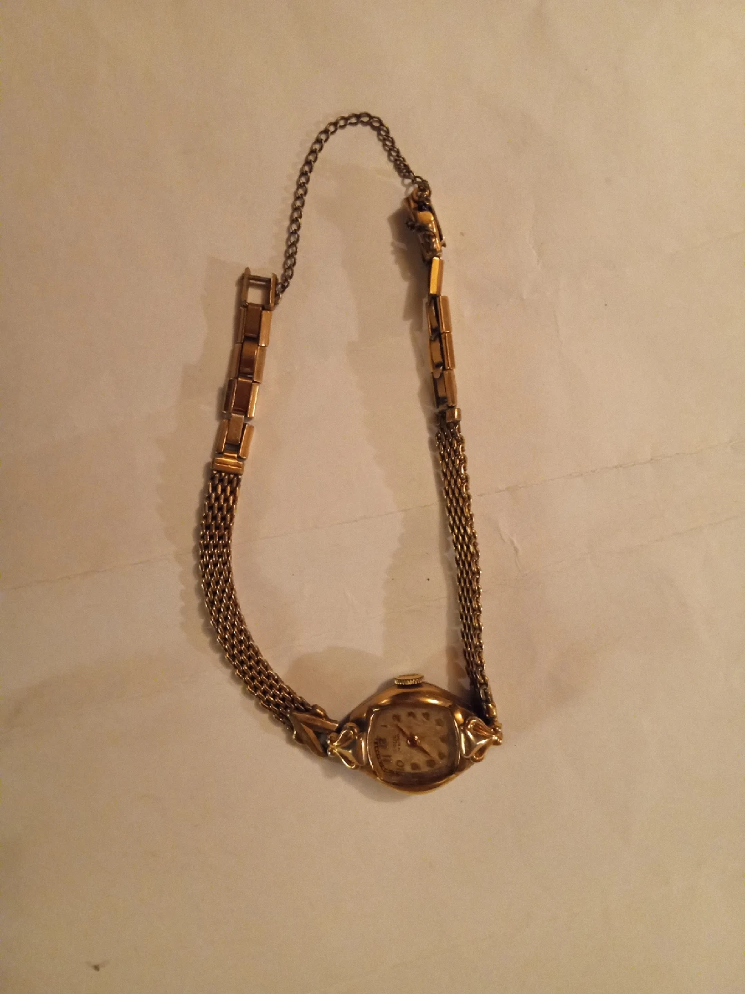 Selling a vintage ladies watch with a gold-tone finish. It's a beautiful piece with a unique design on the face and band. Perfect for someone who loves vintage accessories!