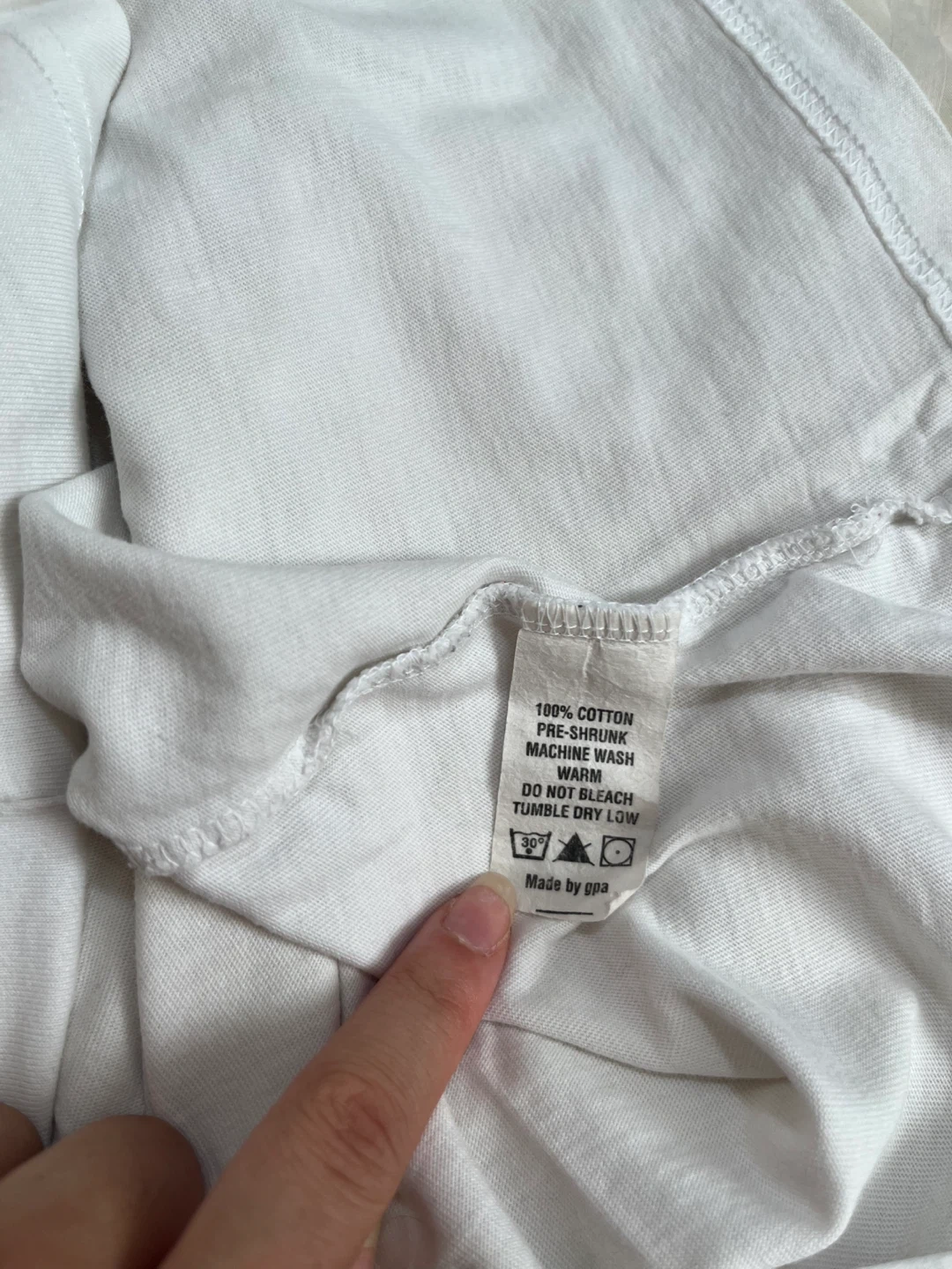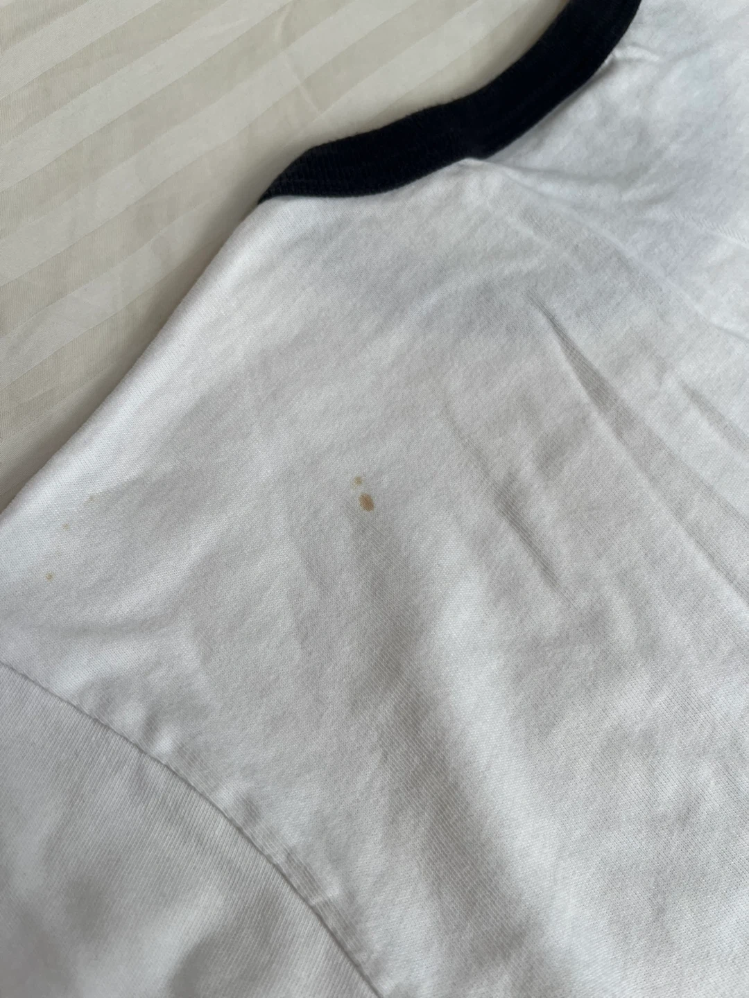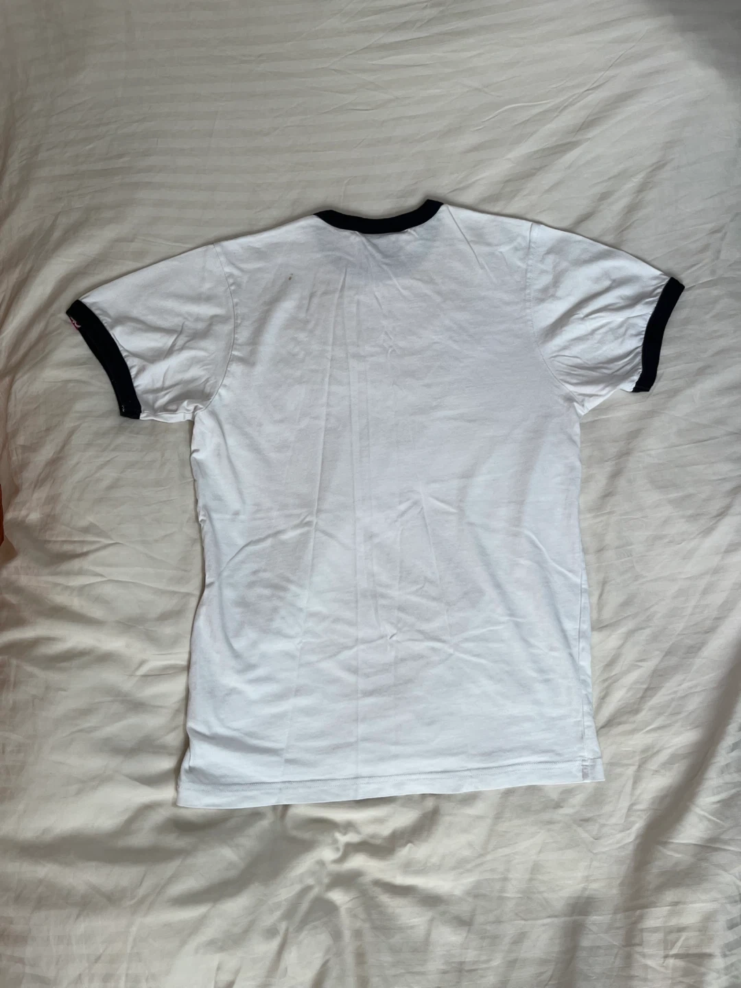Classic white t-shirt with black hems. Perfect for casual wear.