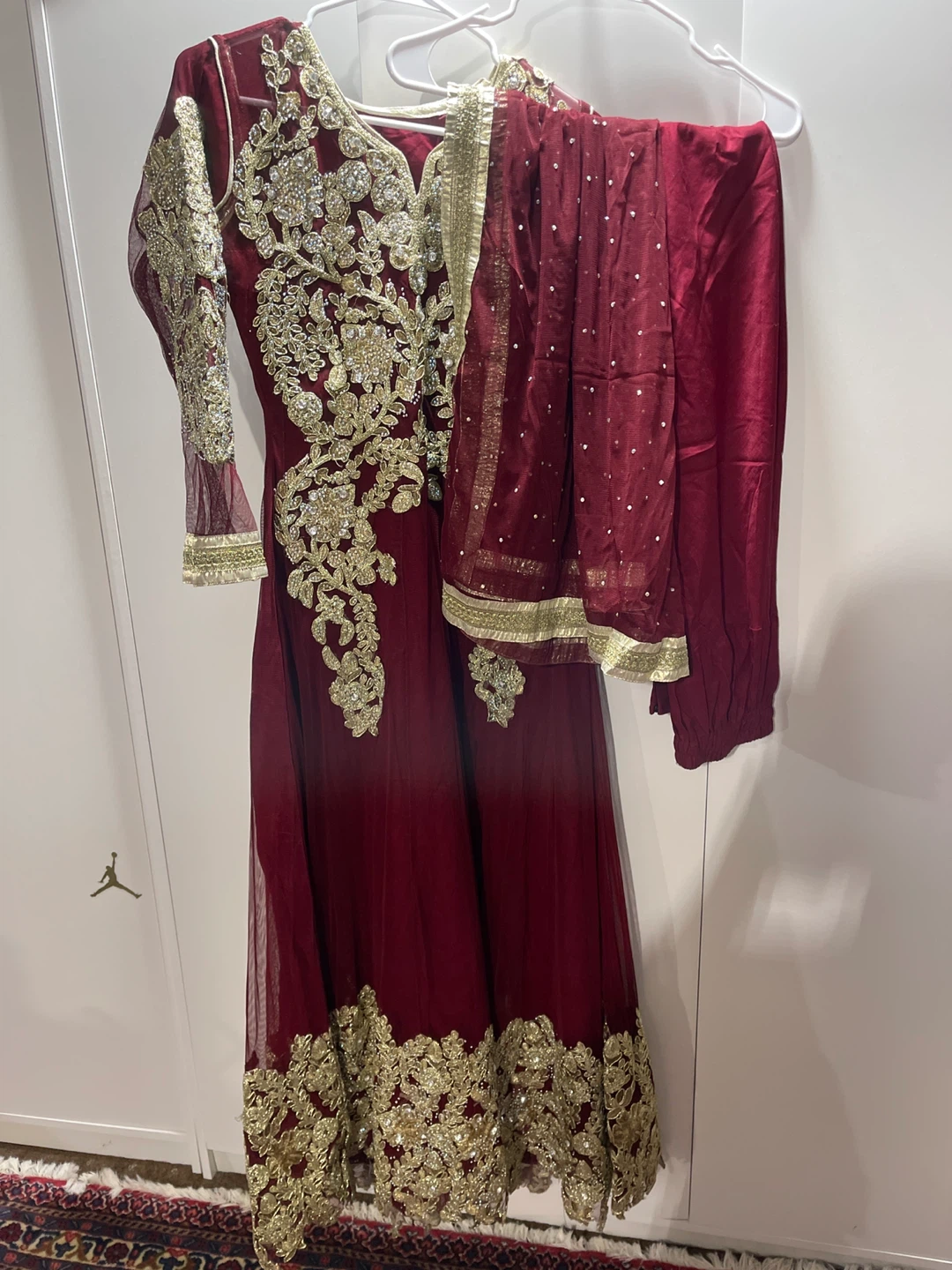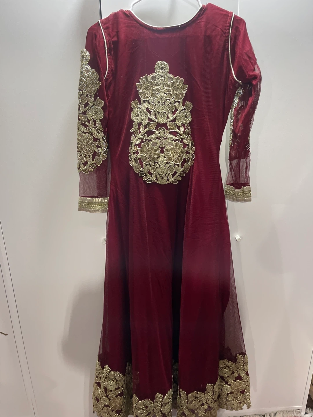 Beautiful lengha dress in a rich burgundy colour with stunning gold embellishments. Perfect for a special occasion!
