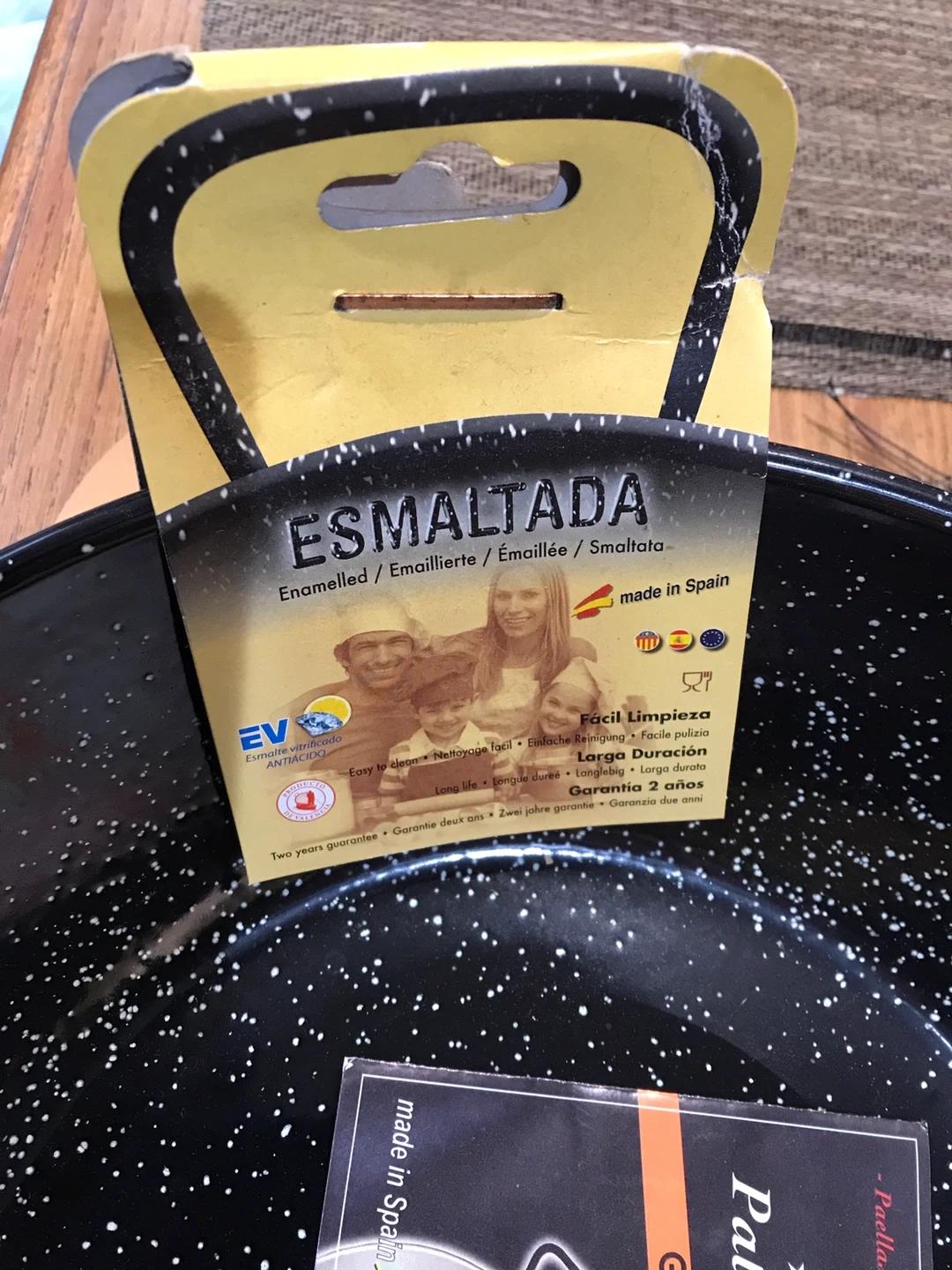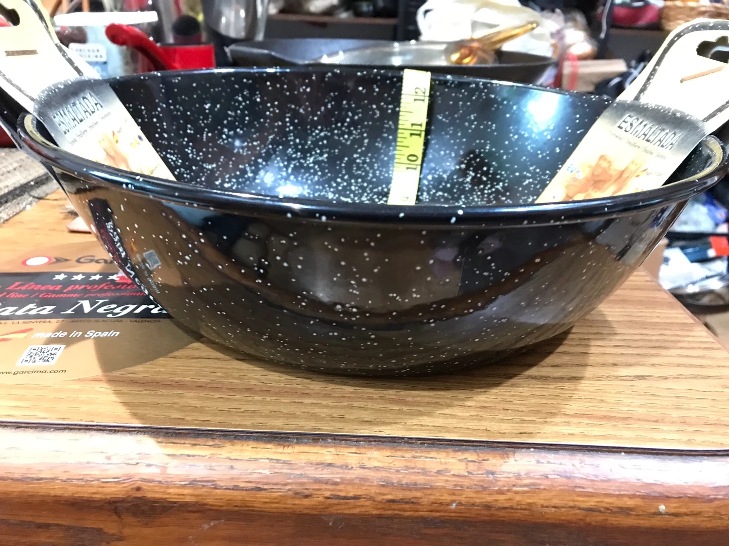 This is an ESMALTADA paella pan, perfect for cooking up a delicious paella! It measures about 13 inches in diameter. This pan is made in Spain and is easy to clean. It also has a long life and is made of enamel