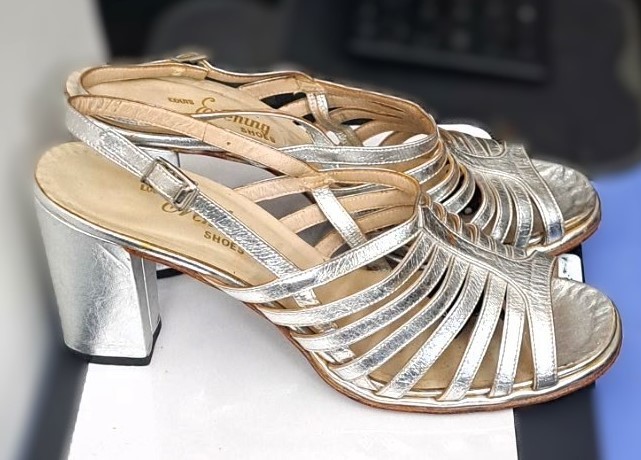 LOUIS Evening SHOES is a vintage brand of shoes. It was was popular in the 1960s to 70's, known for creating strappy sandals and other styles with a "ribcage" design. The shoes are silver slingback sandals with a cage design and a block heel, which are characteristic of the brand's vintage style. It is made of genuine leather and high quality materials. It is in excellent condition. Well kept and sanitized. Heel is 3.5+"