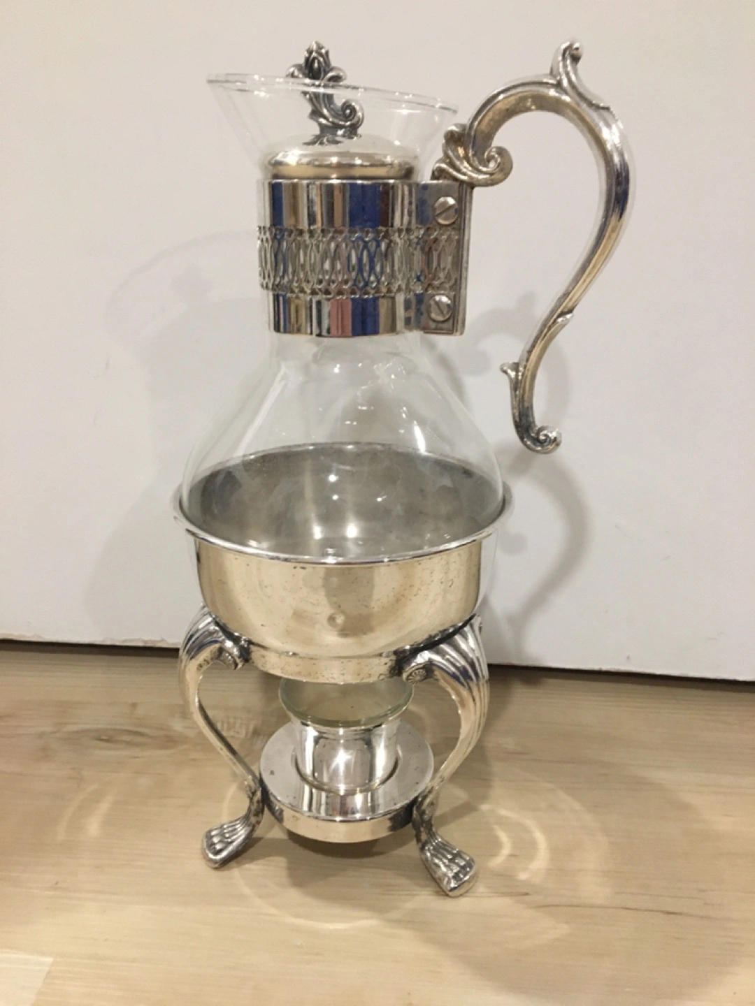 It is in good condition and would make a lovely addition to your kitchen or dining room table! It features a glass carafe and an ornate silver-plated stand with a handle.