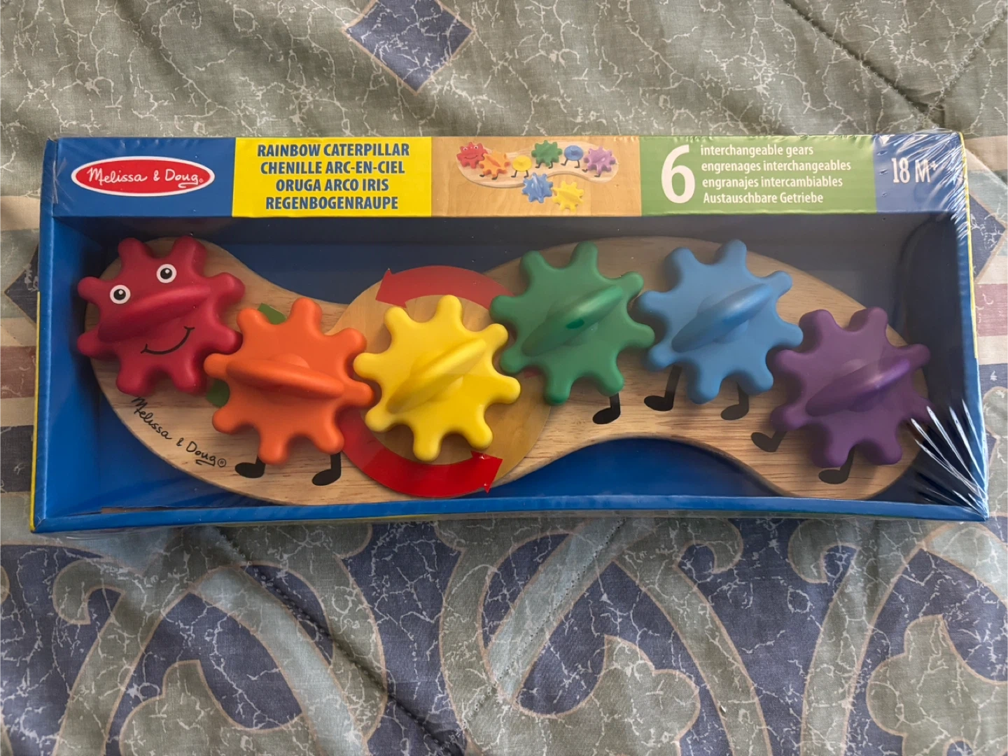 This is a brand new Melissa & Doug Rainbow Caterpillar toy! It features 6 interchangeable gears and is recommended for ages 18 months and up. Perfect for little ones to develop their motor skills and have fun!