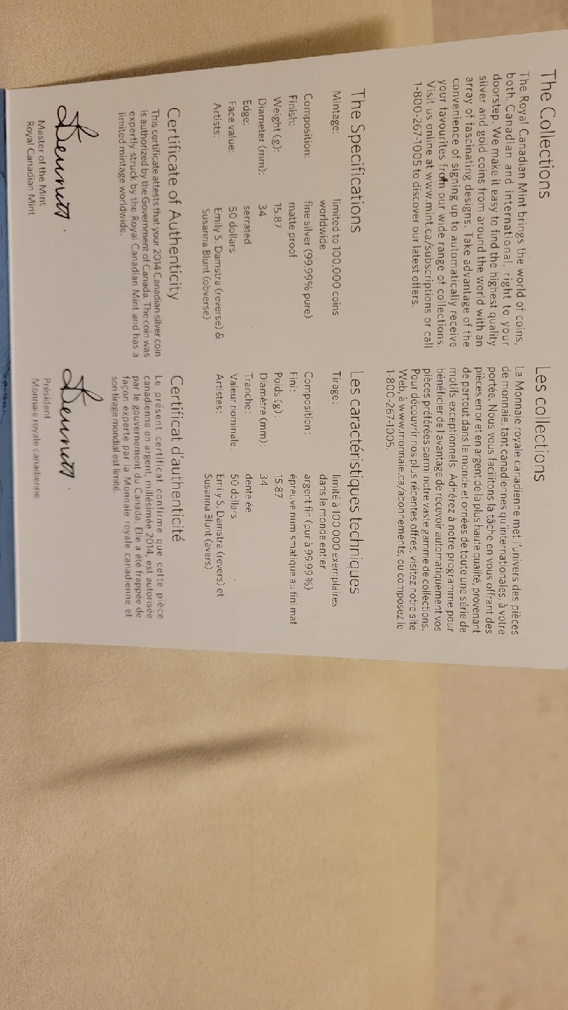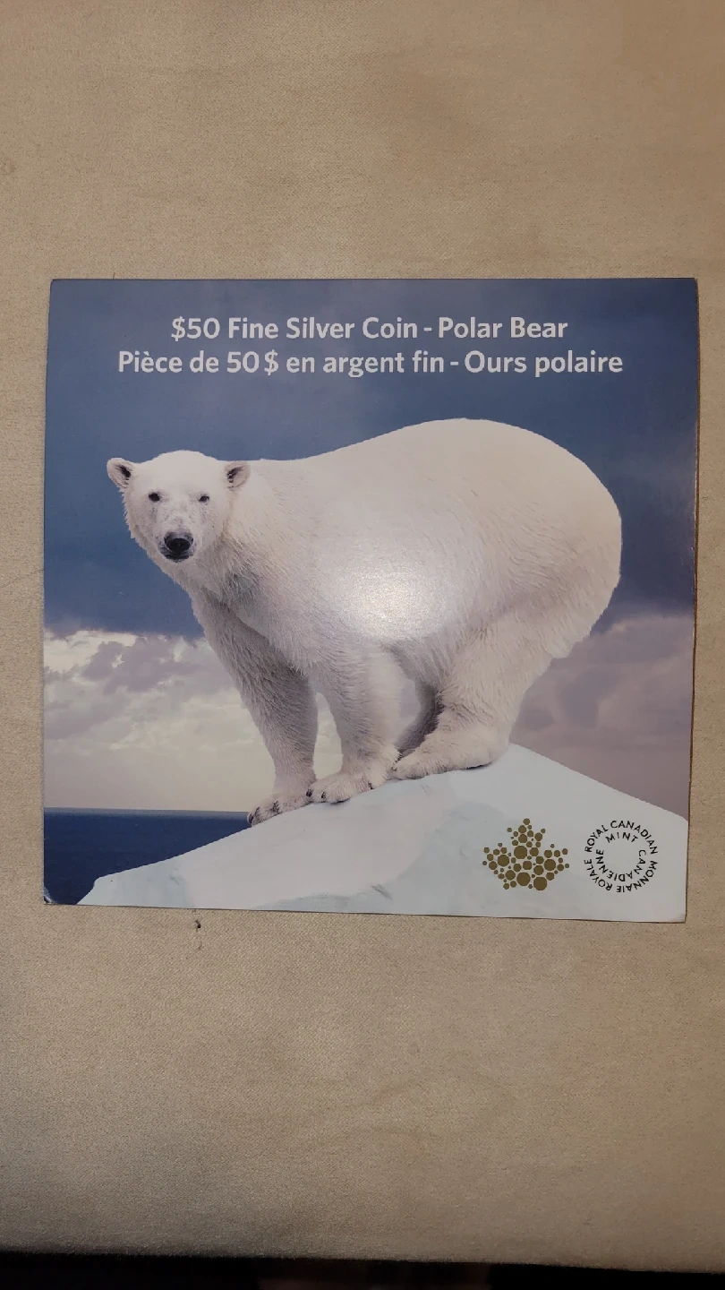 Selling a 2014 Canada $50 fine silver coin featuring a polar bear! It's in great condition and comes with its certificate of authenticity and specifications card. The coin is made of fine silver (99.99% pure), weighs 15.87 grams, and has a diameter of 34 mm. A beautiful piece for any collector!