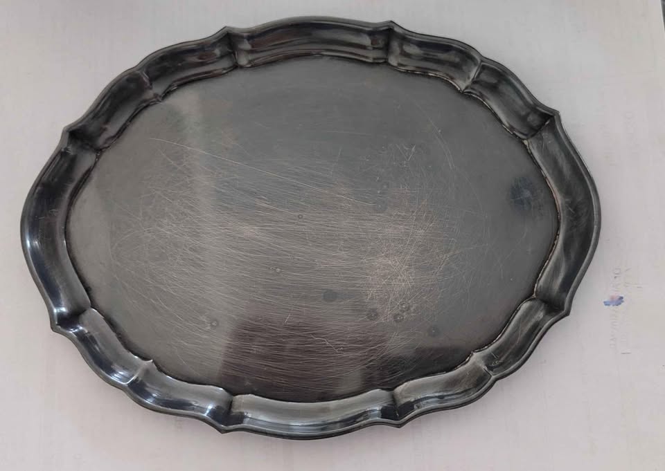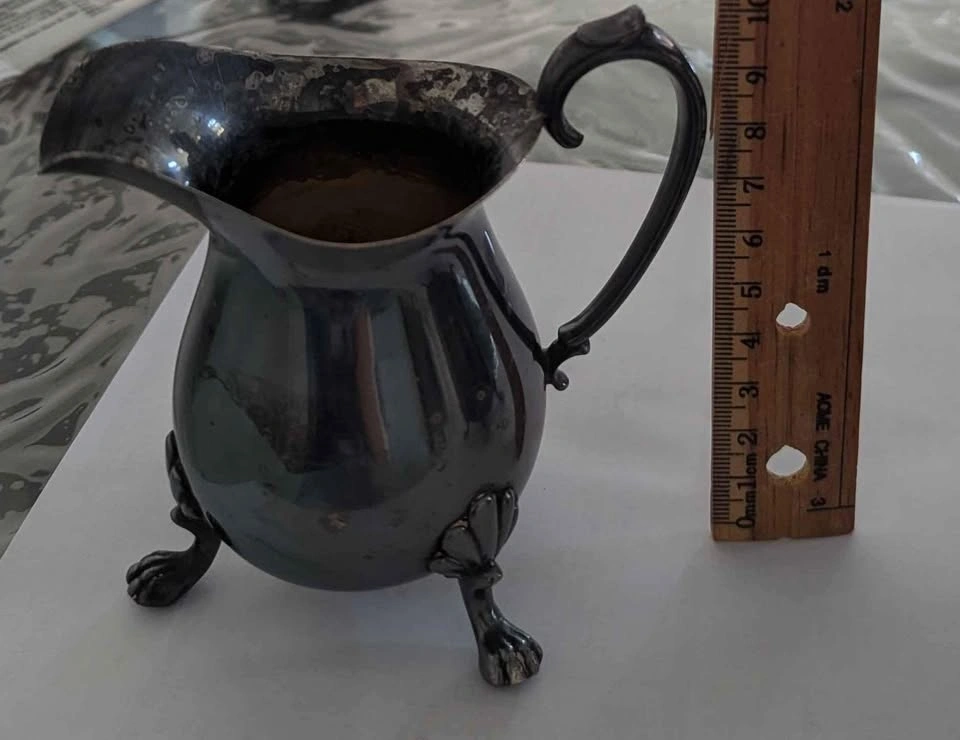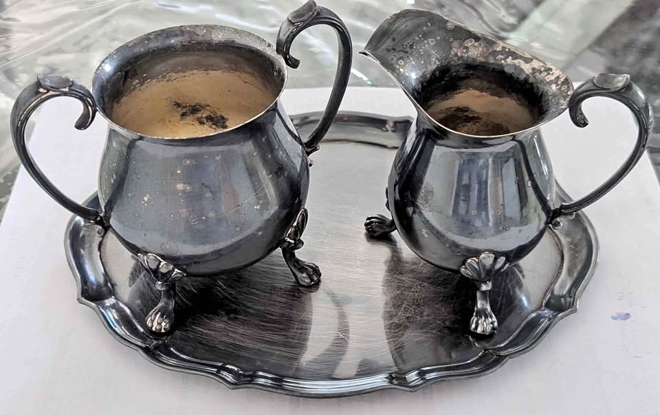 Crescent silverware sugar and cream set, a silver tray and a leaf- shape plate.
