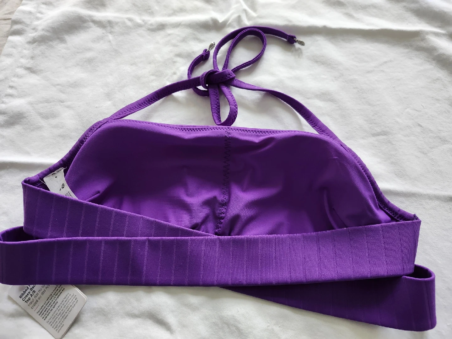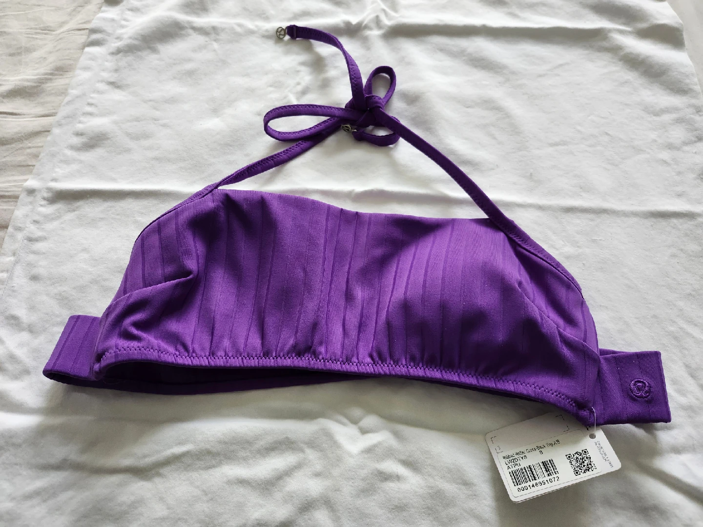 This Lululemon halter top is brand new with tags! It's a ribbed halter-cut swim top made from supportive ribbed fabric. It's a size A/B and comes in a lovely purple colour