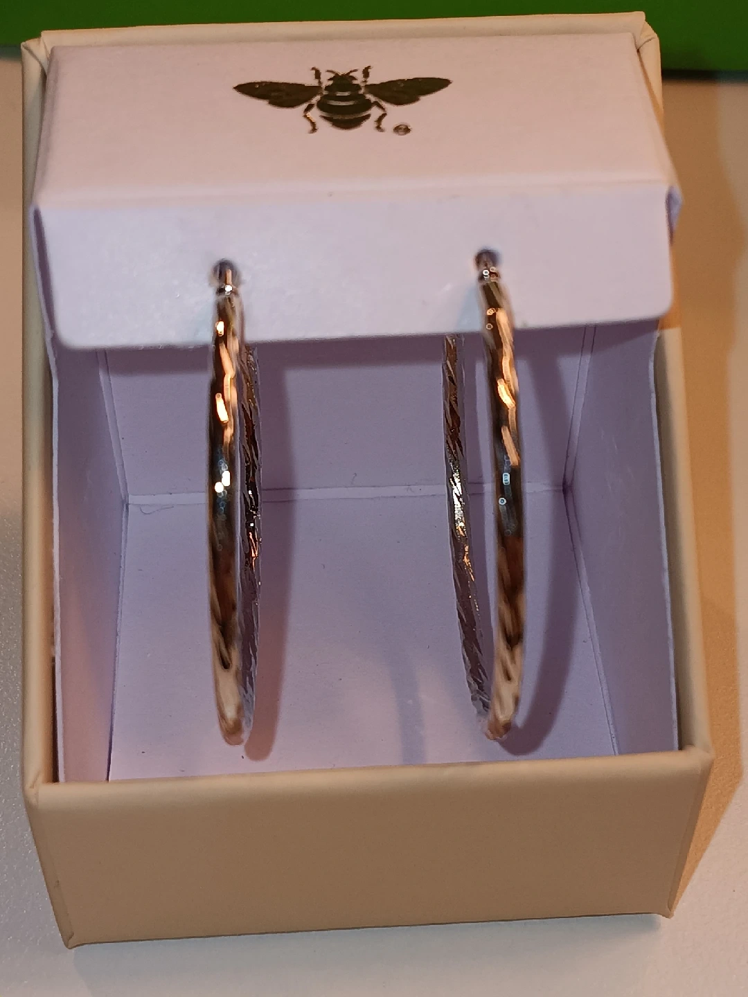 These are a pair of hoop earrings that come in a box with a bumble bee logo on top. They appear to be in new condition and ready for a new home!