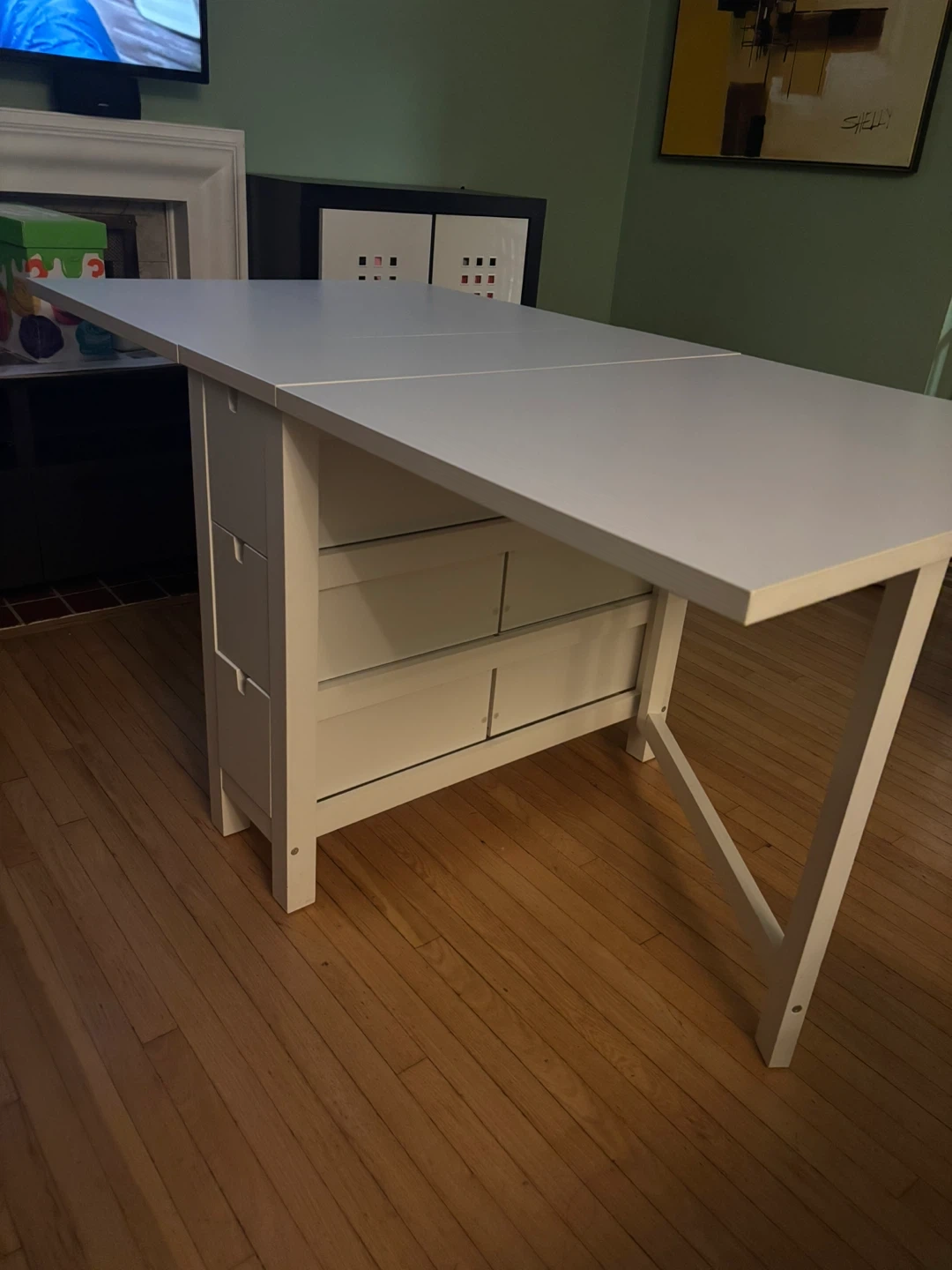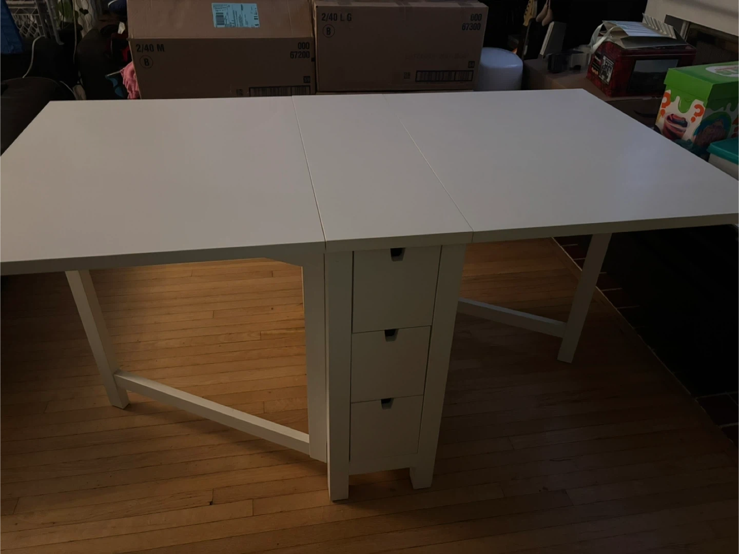 Selling a white IKEA Norden extendable dining table! It's in great shape and perfect for smaller spaces that need some flexibility. The table has drop leaves that let you adjust the size, and it includes handy drawers for storing placemats or cutlery. A great addition to any home!