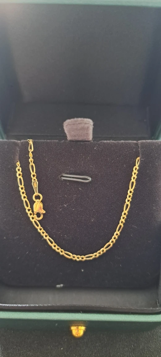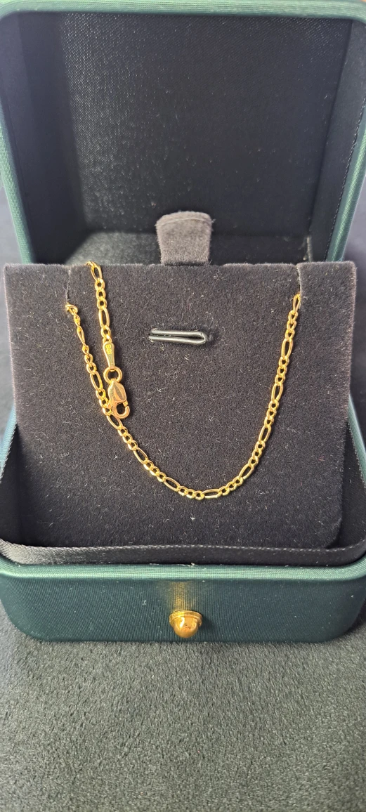 Selling a beautiful gold Figaro chain necklace. It's in great condition and comes with its original box. This necklace would be a lovely addition to any jewelry collection!