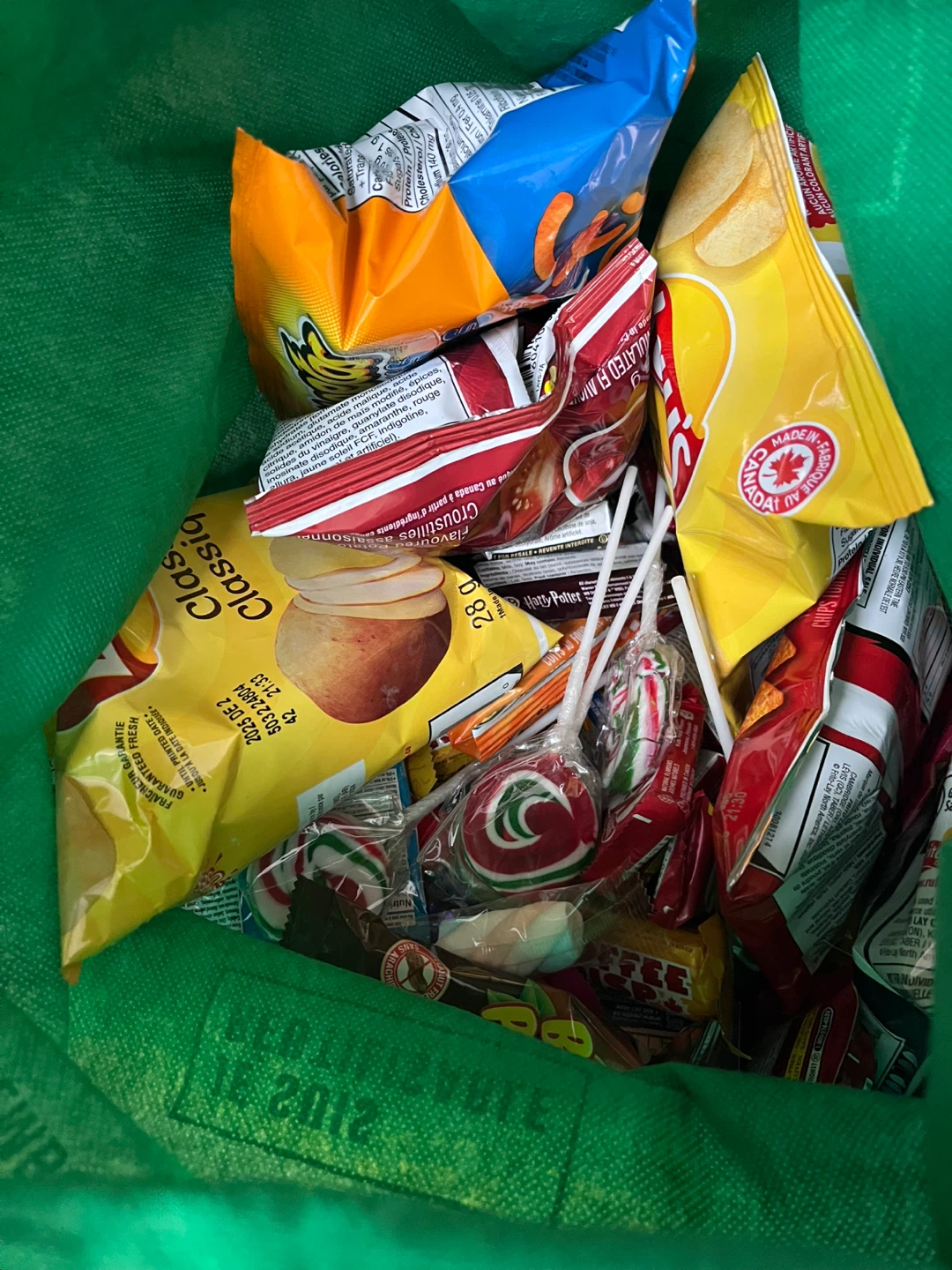 I have a bag full of assorted snacks and candies! You'll find a mix of chips, lollipops, and other treats. Perfect for a quick snack or a little indulgence