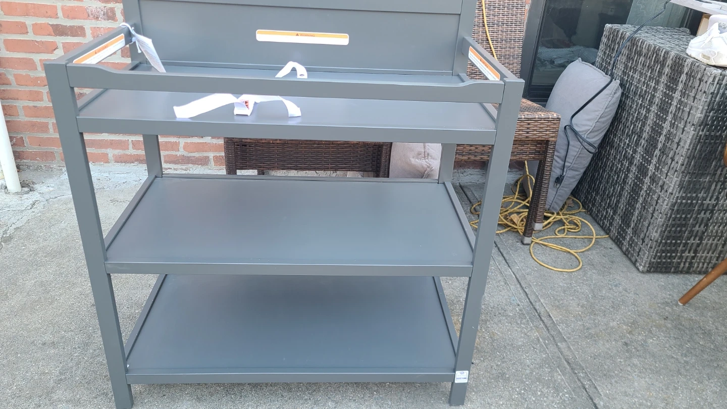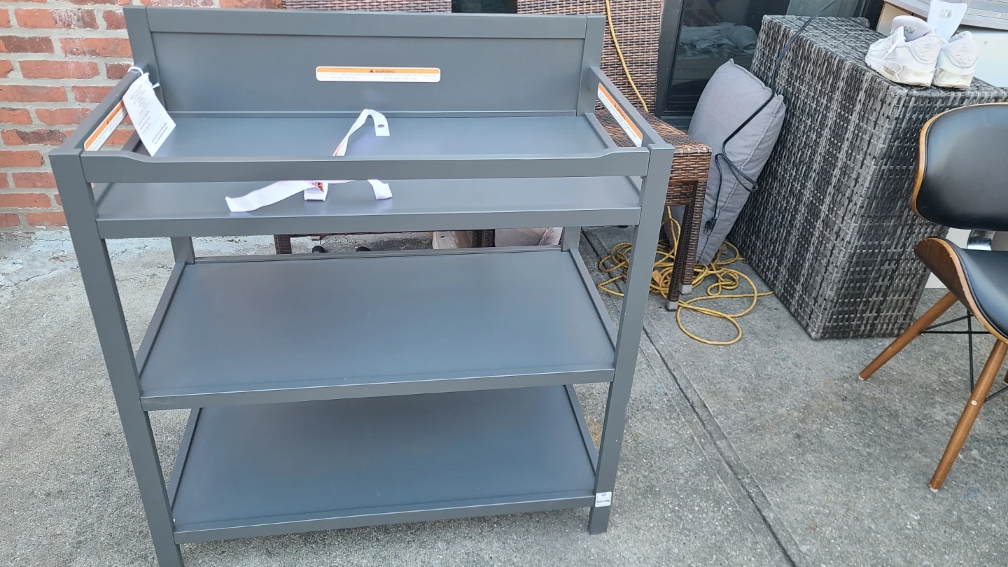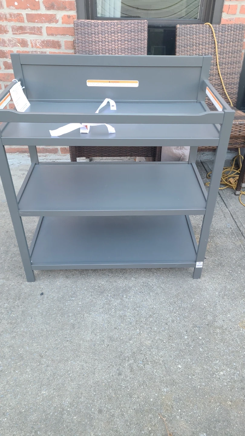 Selling a gray baby changing table. It's in great condition and ready for a new home. It features three shelves for ample storage of diapers, wipes, and other baby essentials. It’s a sturdy and practical piece of furniture for any nursery. Measure 34.5 inch long by 18 inch wide by 38 inch high