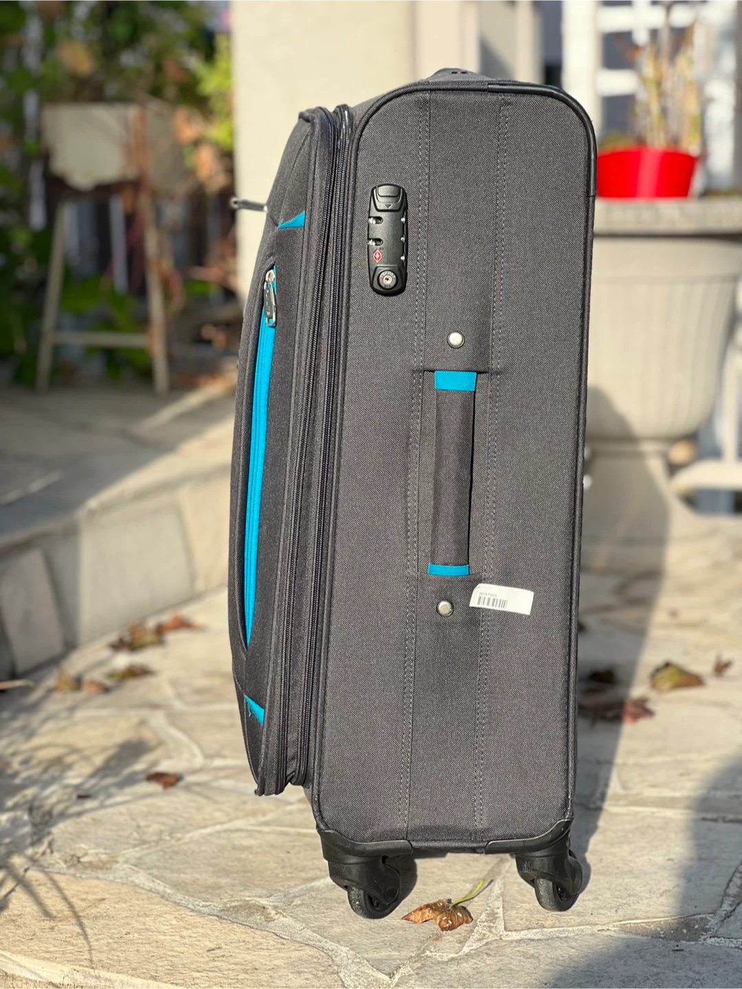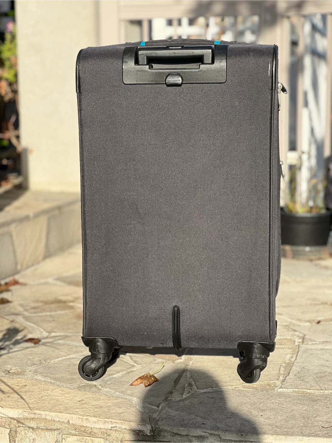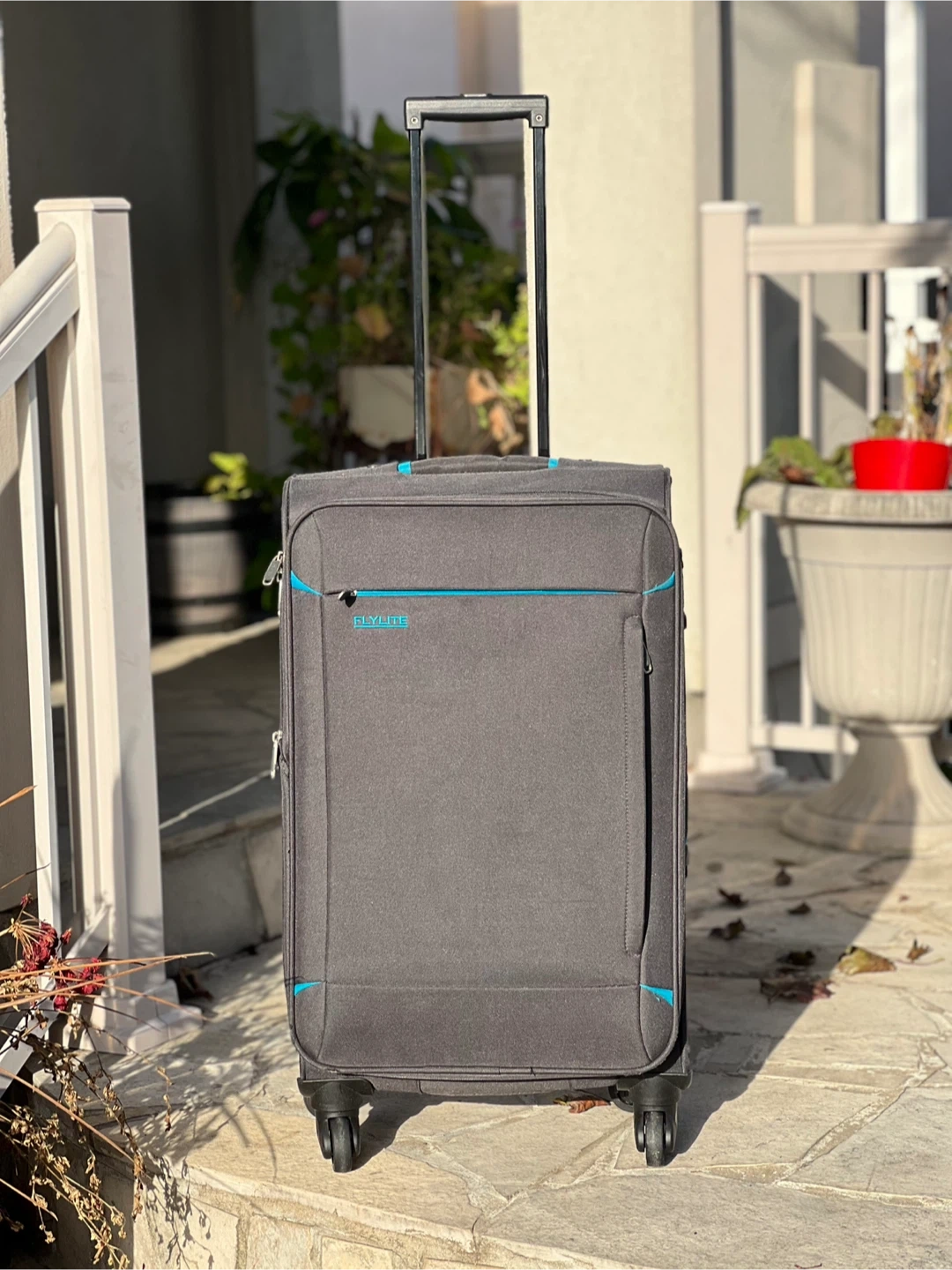 This is a Flylyte carry-on suitcase in gray. It has a retractable handle and wheels for easy transport. Perfect for your next trip!