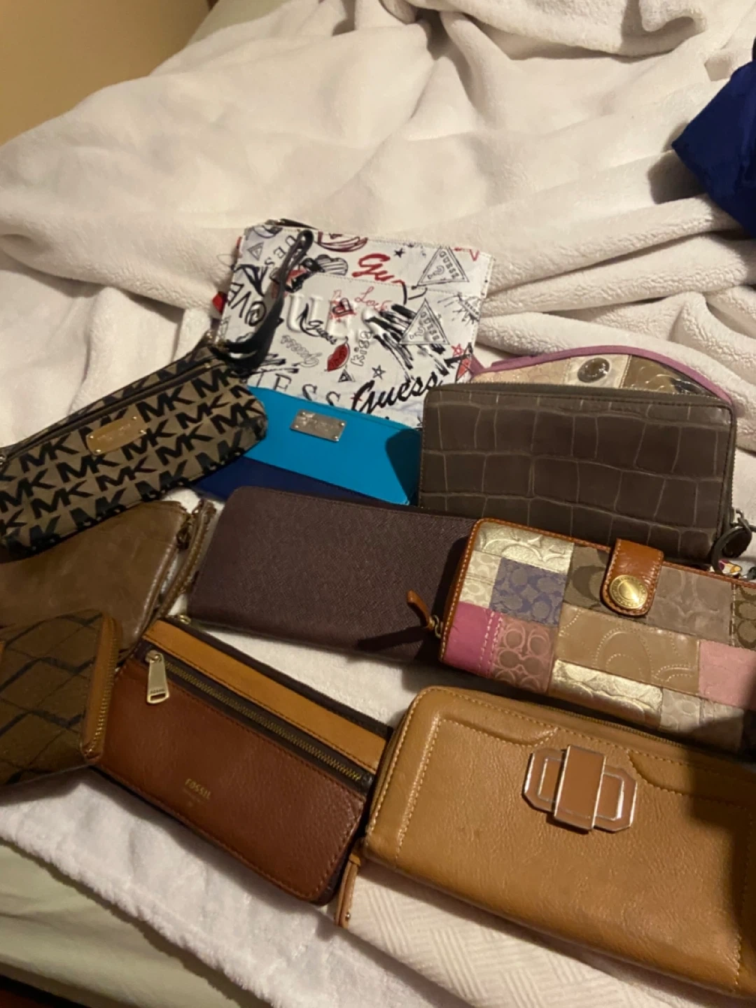 Selling a collection of used wallets. There's a variety of brands including Michael Kors, Fossil, and Guess. They are in used condition, please see the photos for details!