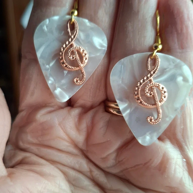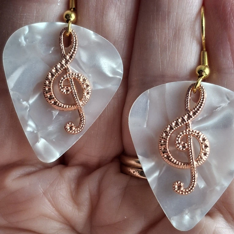 Hand made white guitar pick earrings featuring a rose gold treble clef design! These earrings are perfect for music lovers or anyone looking for a fun and accessory.
