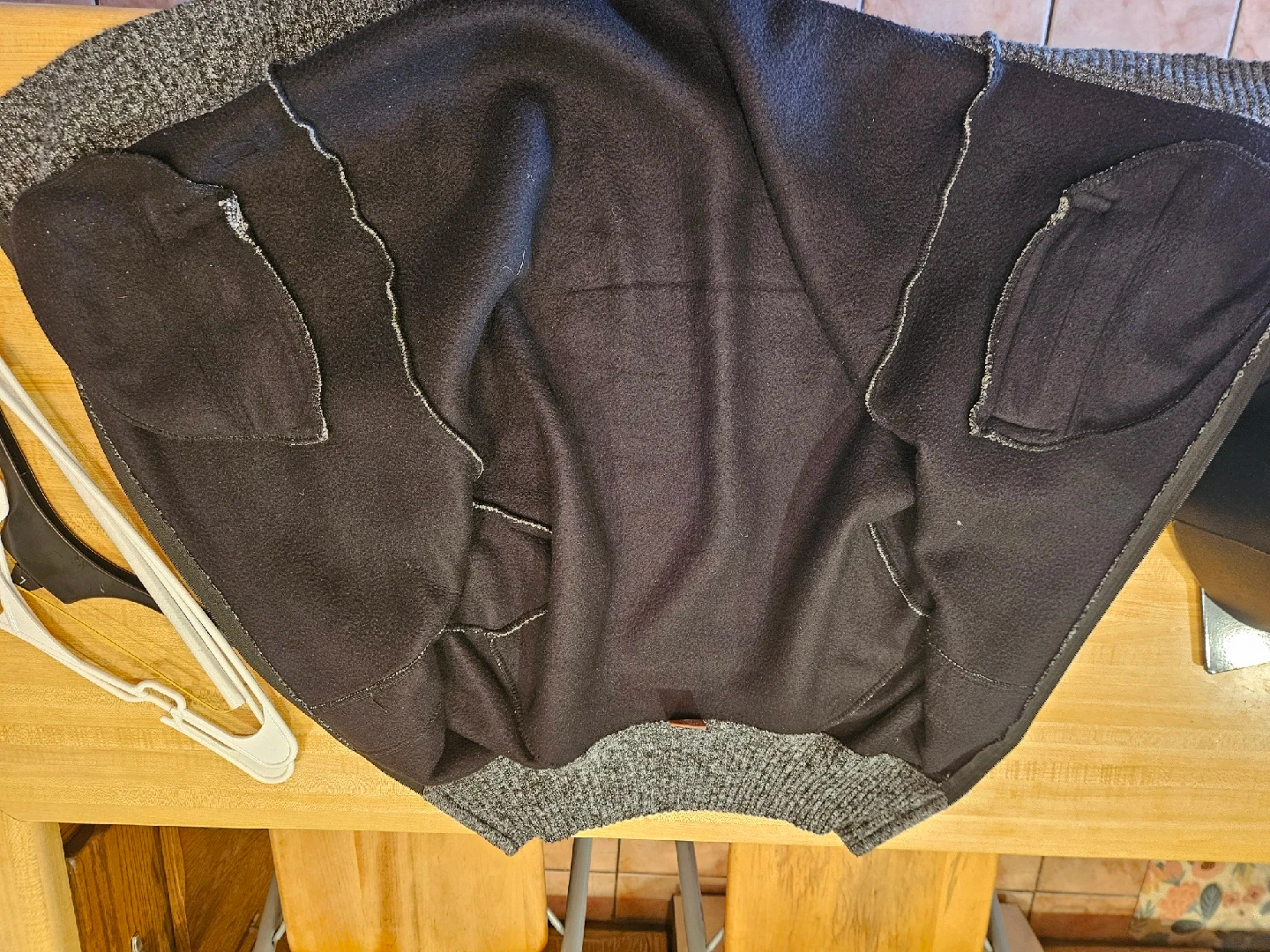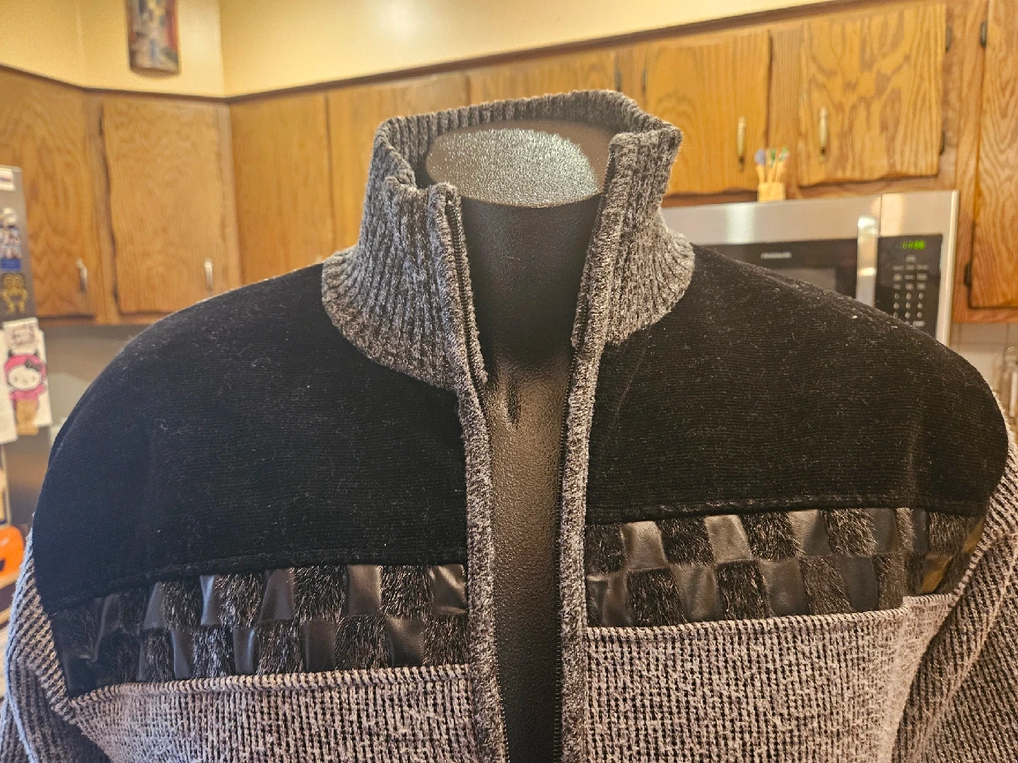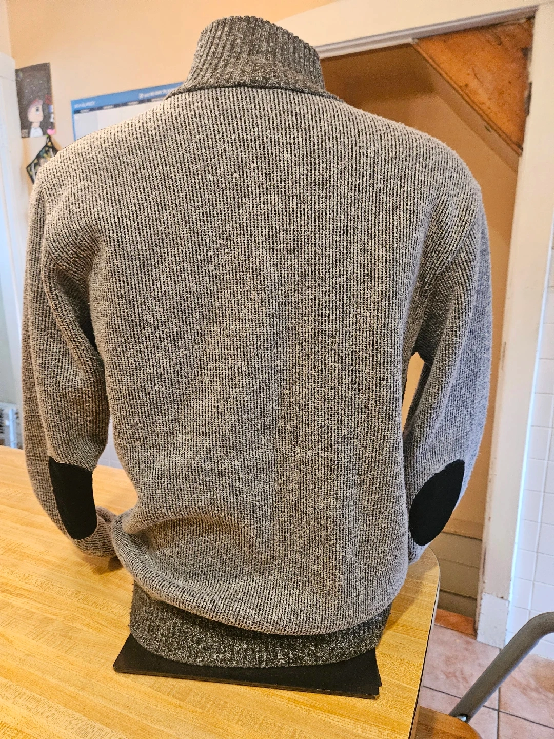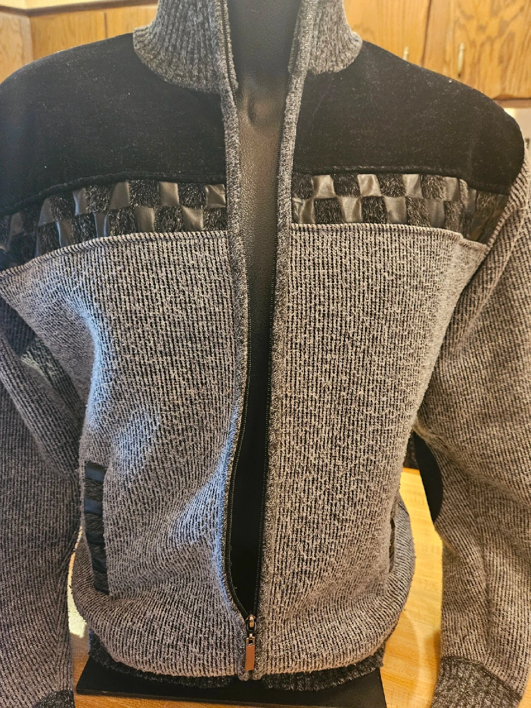 Here's a stylish men's cardigan sweater in gray and black. It features a full zip and is perfect for layering. The material is a comfortable knit, ideal for cooler weather. It's in great condition.