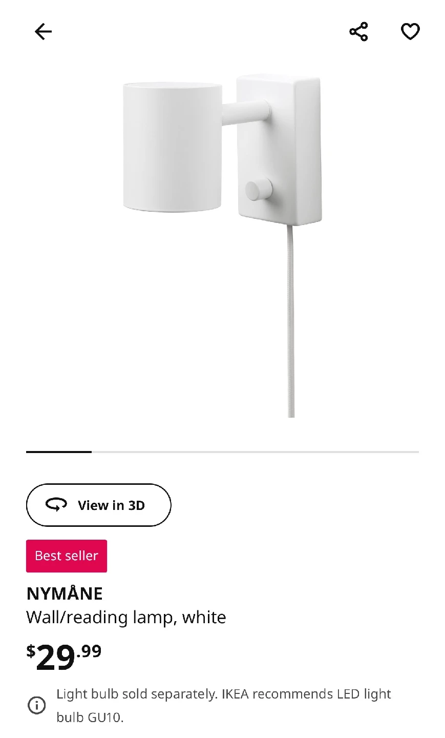 Selling a pair of IKEA NYMÅNE wall/reading lamps in white! They're in great condition and ready to brighten up your space. Originally bought for $29.99 each.