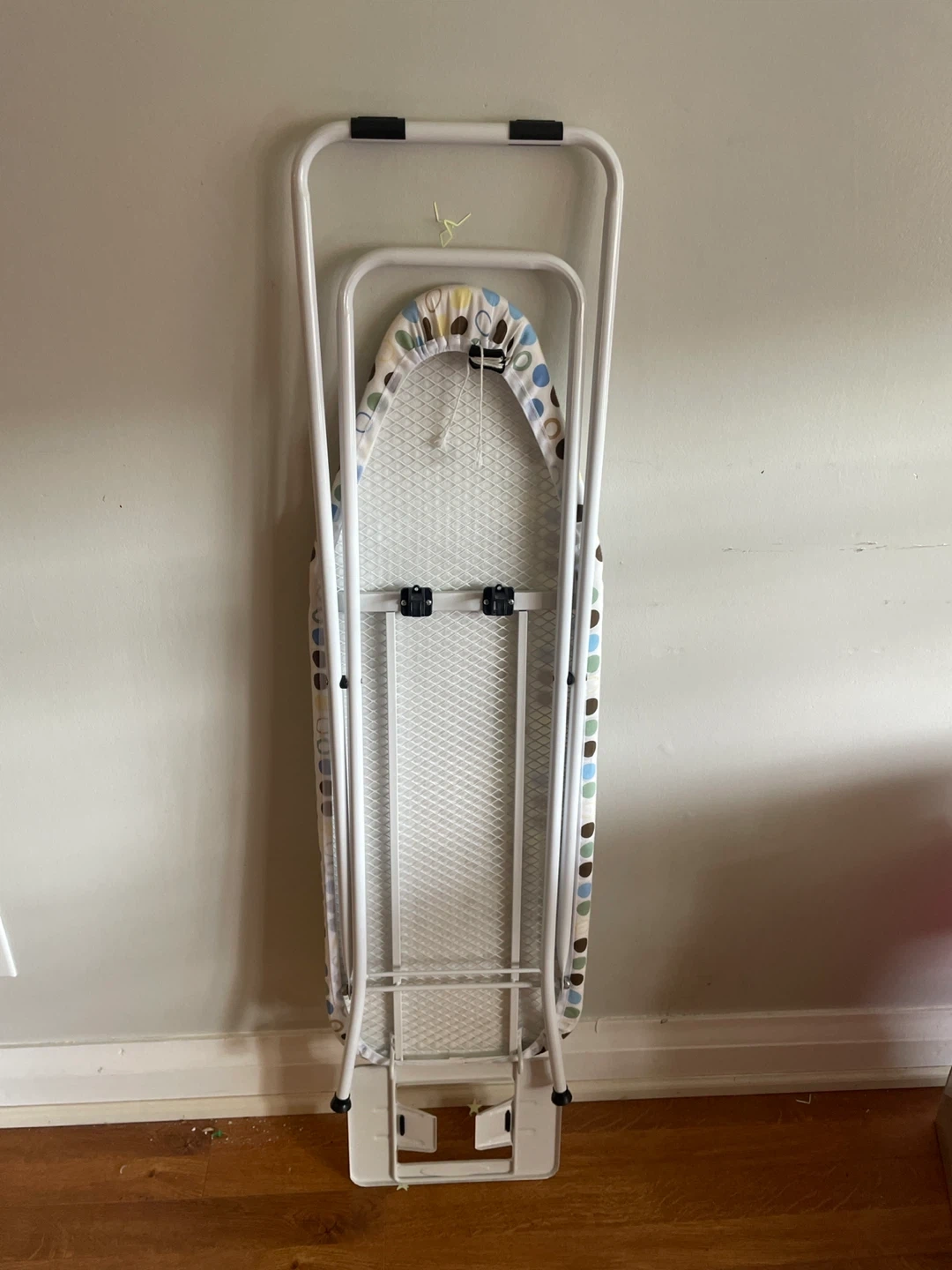 Foldable ironing board in good condition! It features a colourful polka dot pattern on the ironing surface and a sturdy white frame. Folds up easily for convenient storage. Must be pick now