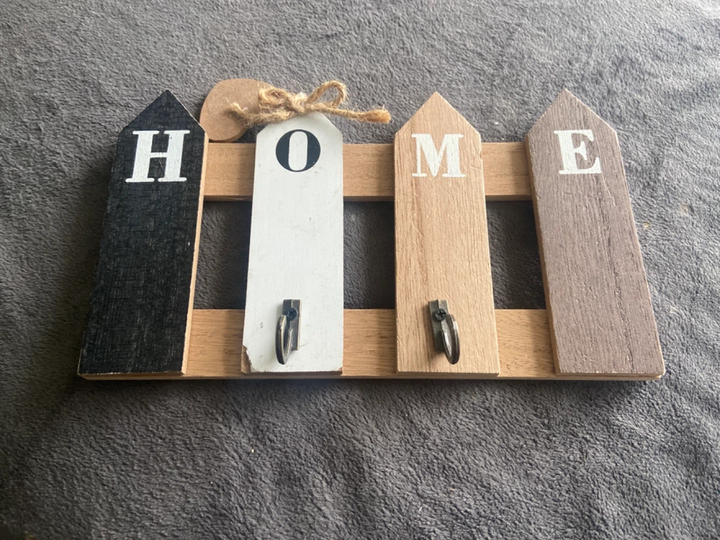 Selling a cute 'HOME' wall-mounted key holder! It's perfect for keeping your keys organized and adding a touch of charm to your entryway. There is a small chip on the white letter.